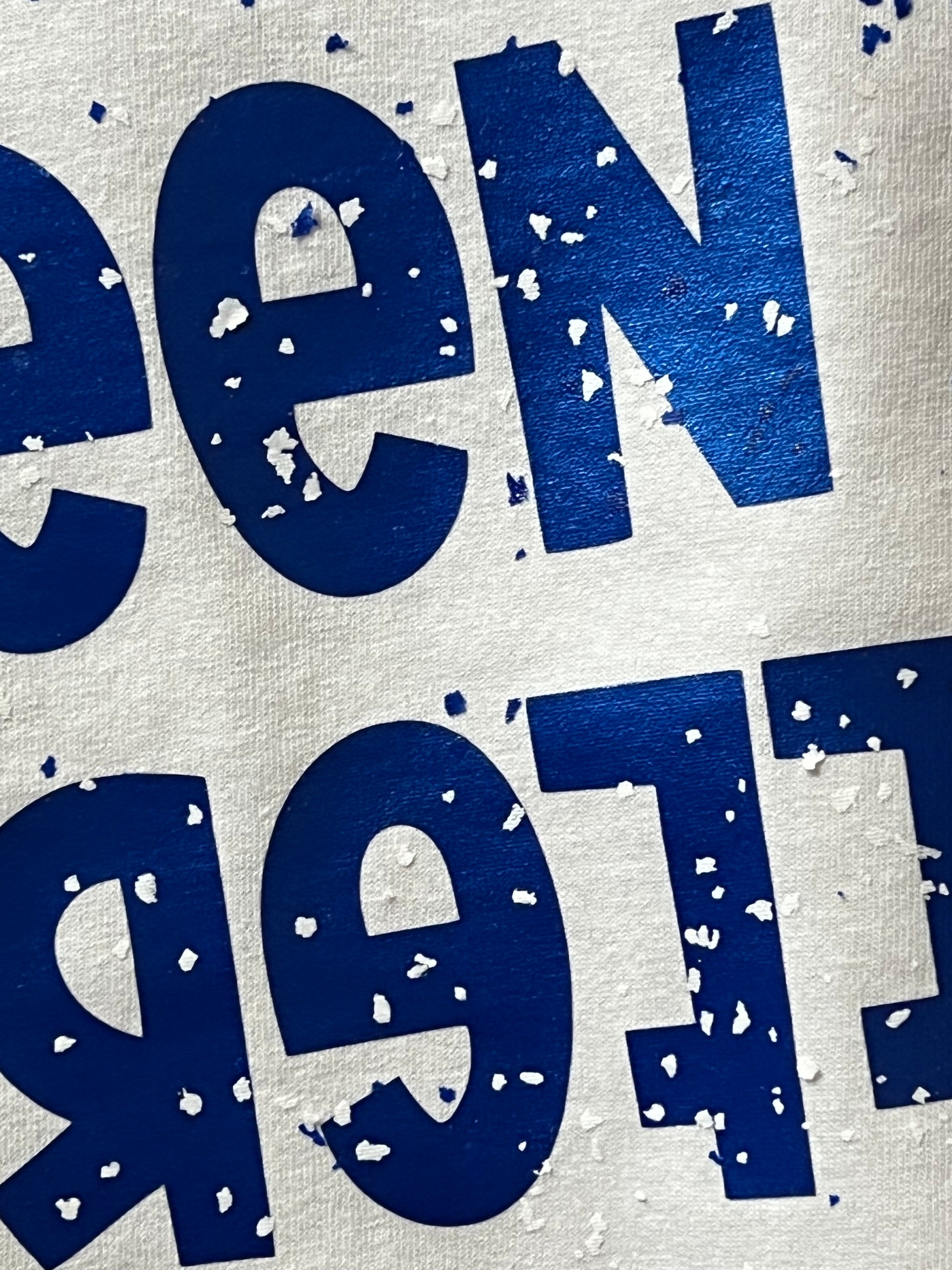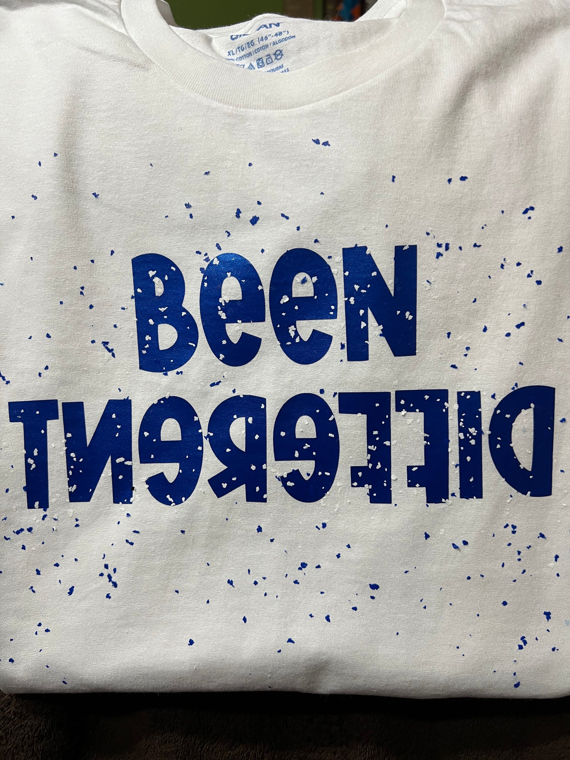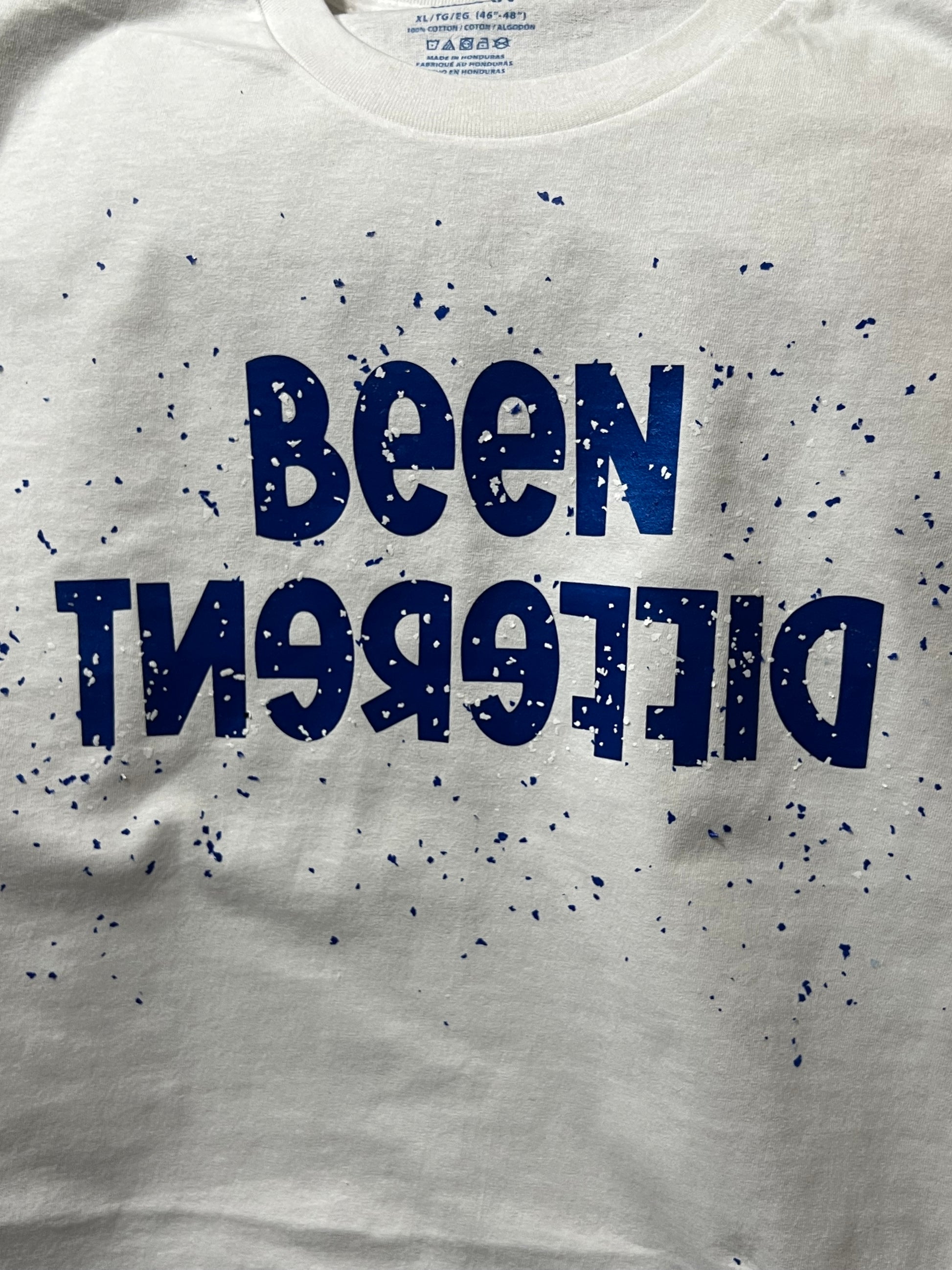 This versatile unisex white shirt features short sleeves and is available in various sizes. The design showcases "Been Different" in striking metallic blue letters, complemented by playful white and blue confetti accents. Perfect for standing out with a touch of individuality and style.