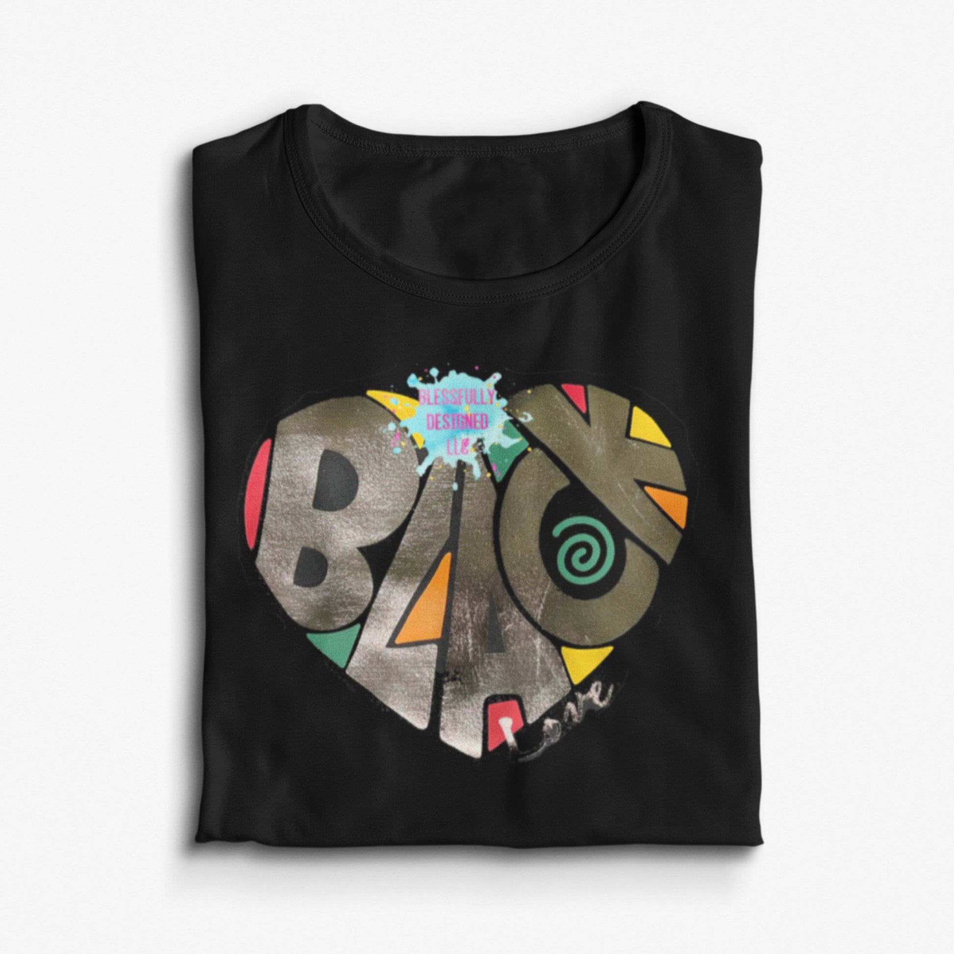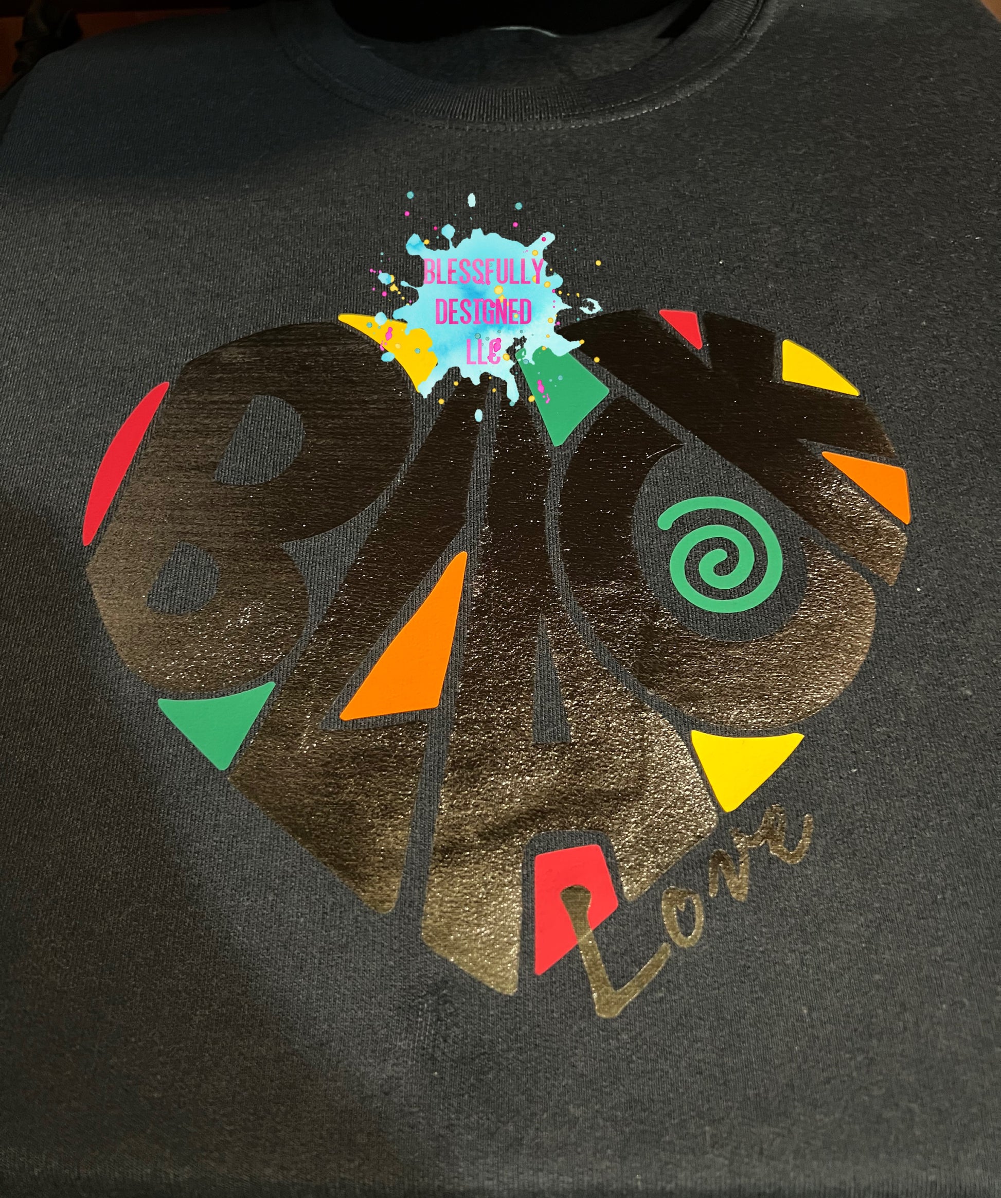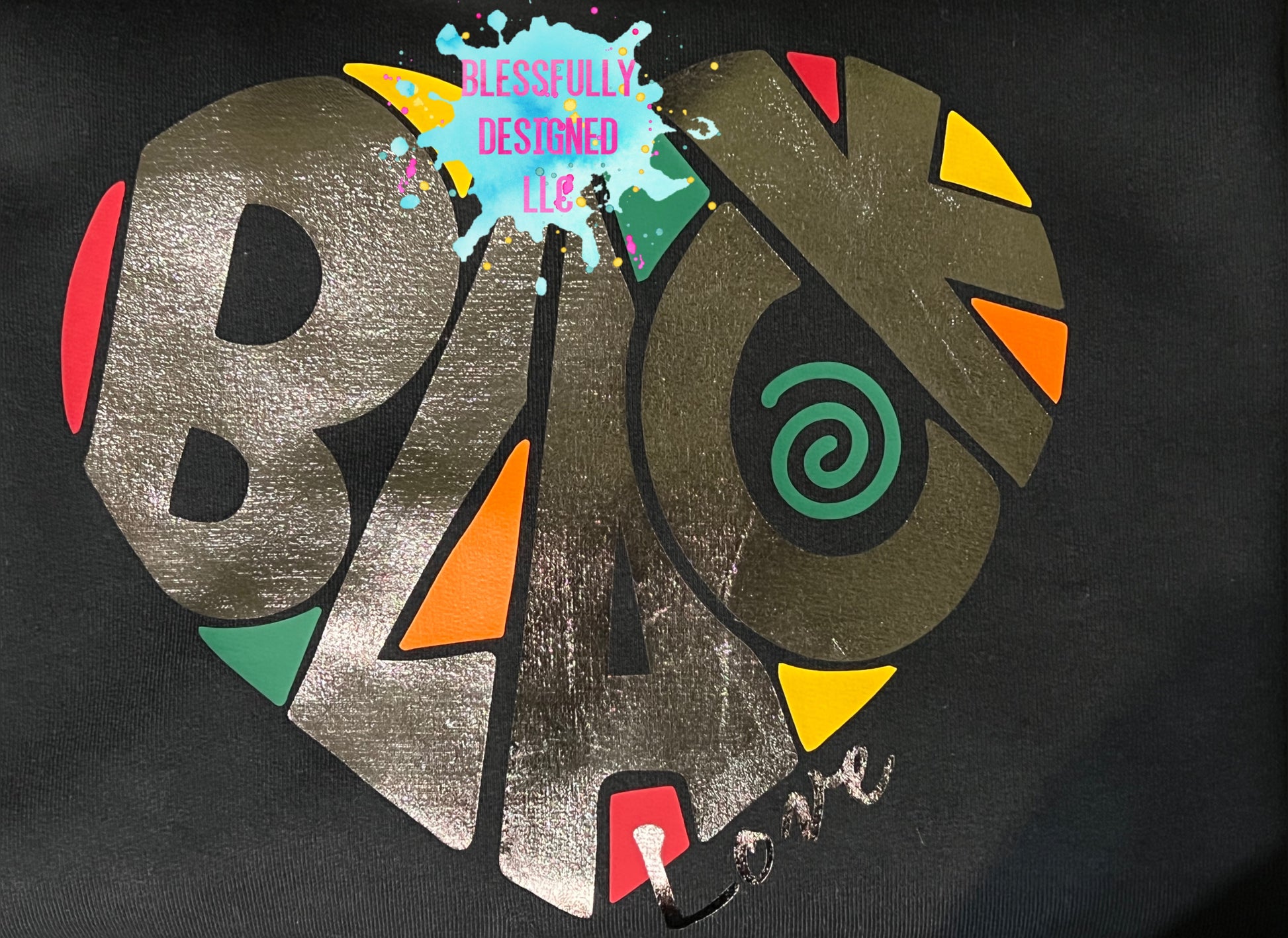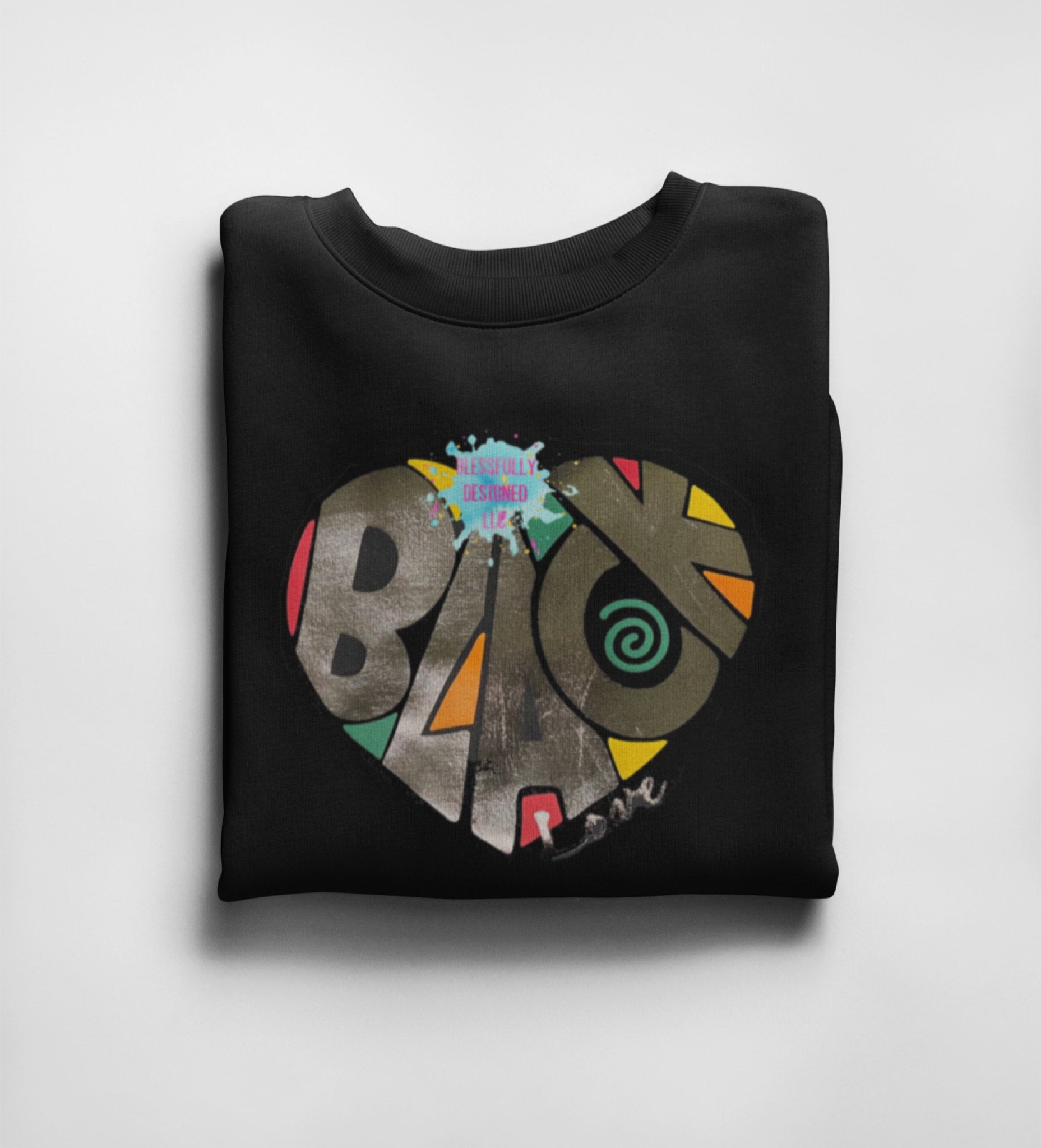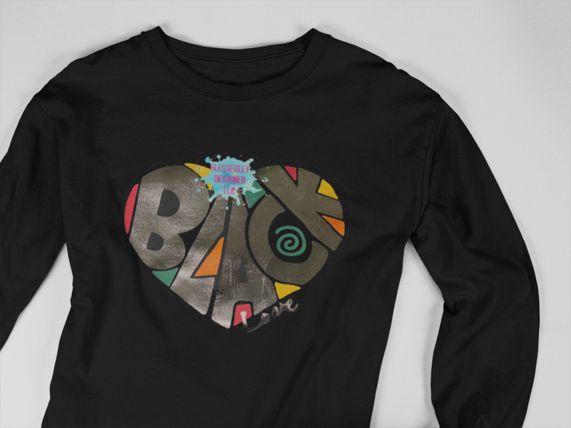 Black Love Sweatshirt or Long Sleeve T-Shirt, made from soft, comfortable cotton in classic black. Featuring unisex sizing for a relaxed fit, this piece showcases a vibrant multicolored geometric design that celebrates Black love and culture. Perfect for casual wear with a meaningful message.