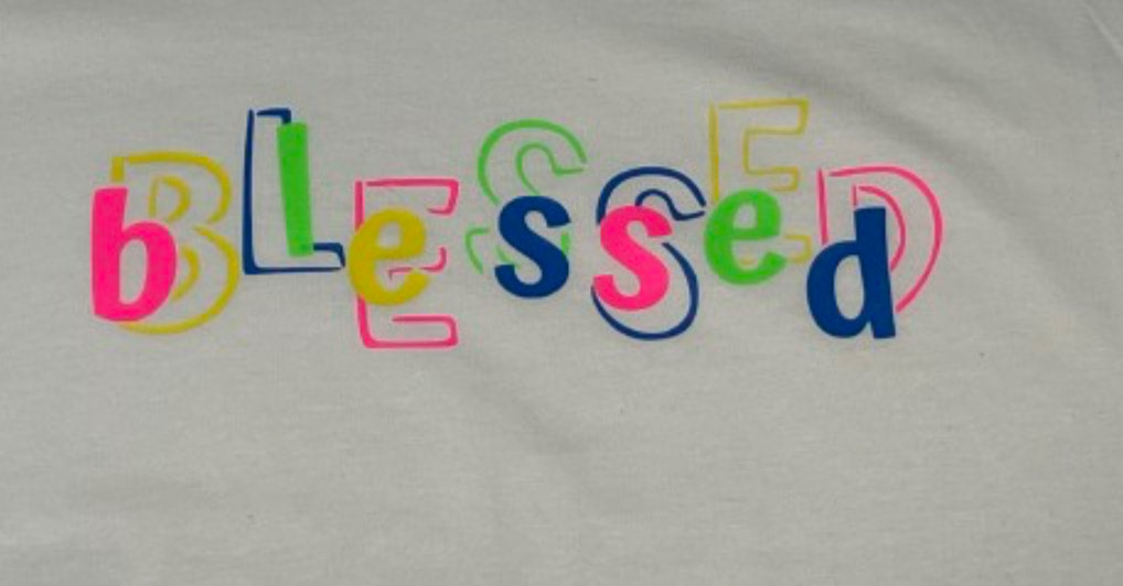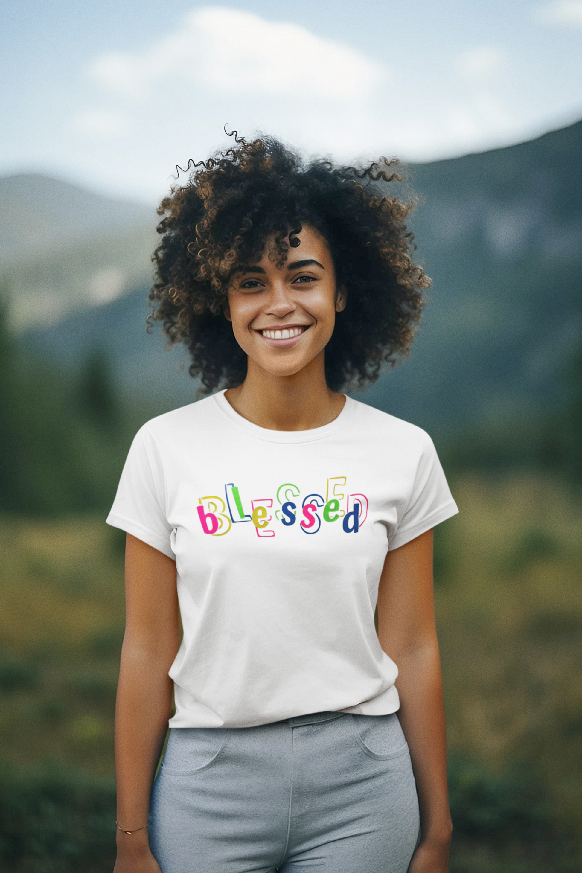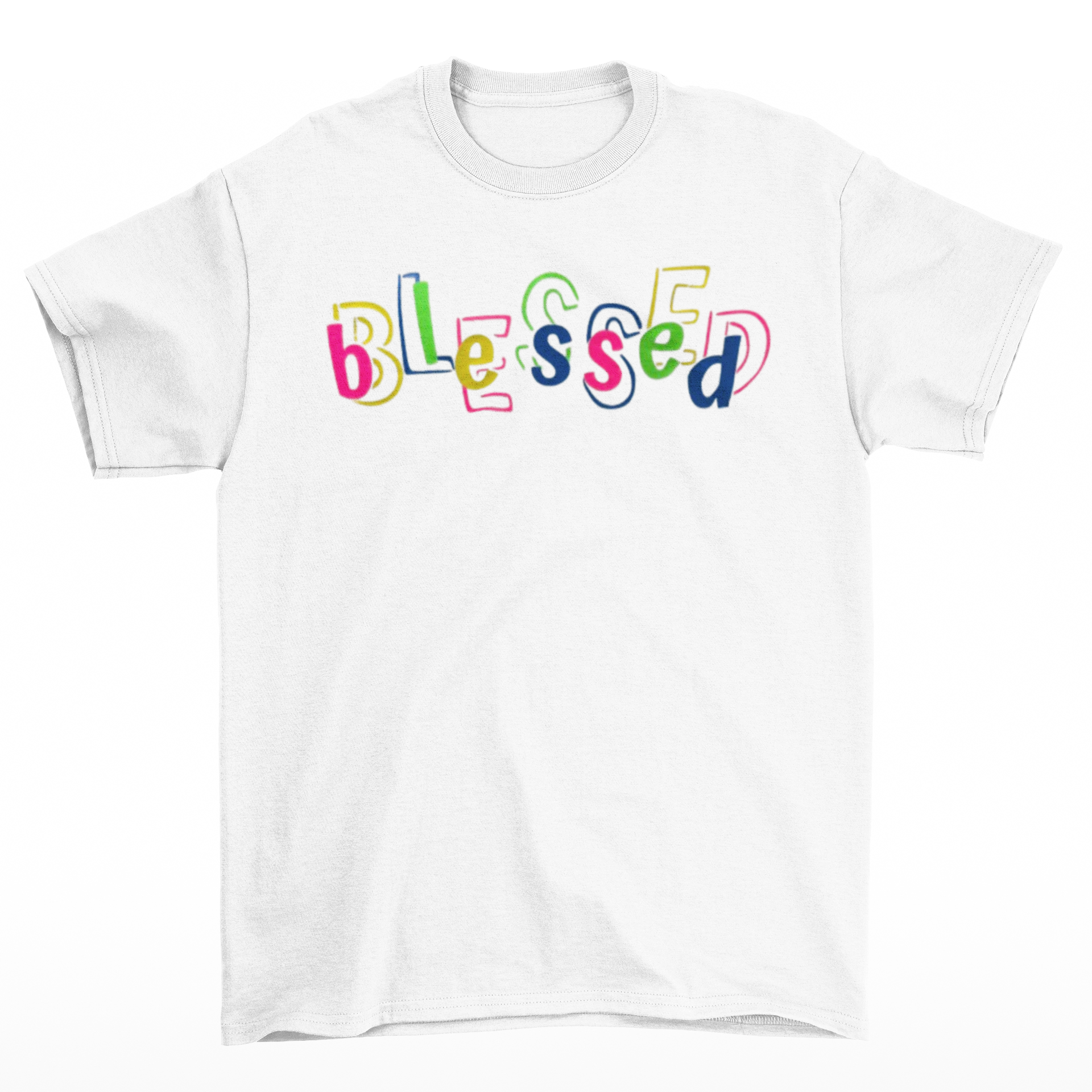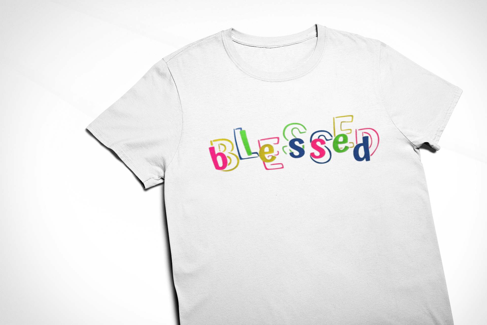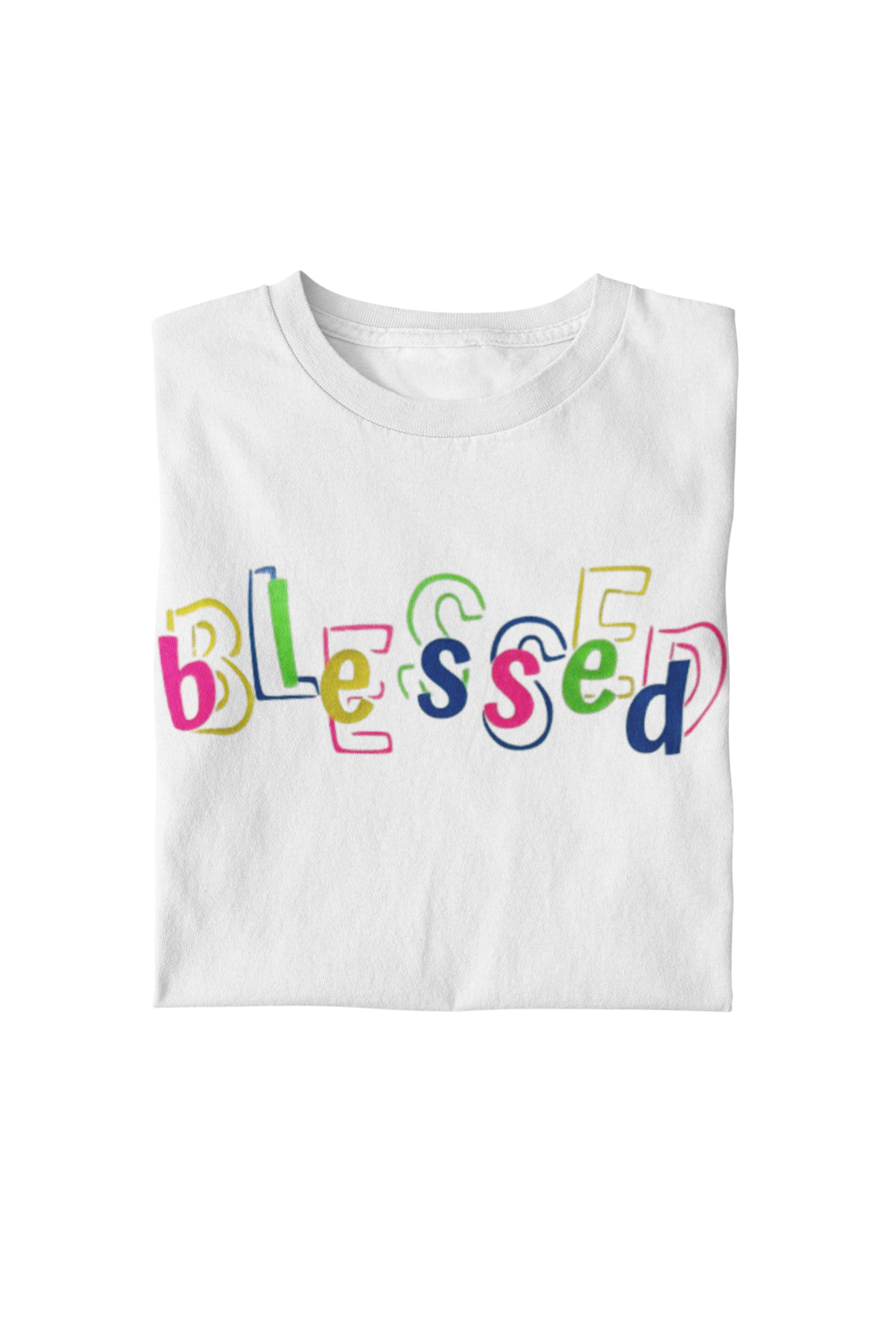 Introducing our White Cotton T-Shirt, featuring the word "Blessed" in vibrant neon colors. This unisex tee combines comfort and style with its soft, breathable fabric, short sleeves, and classic crew neck design. Perfect for any casual occasion, it’s a standout piece that adds a pop of positivity to your wardrobe.
