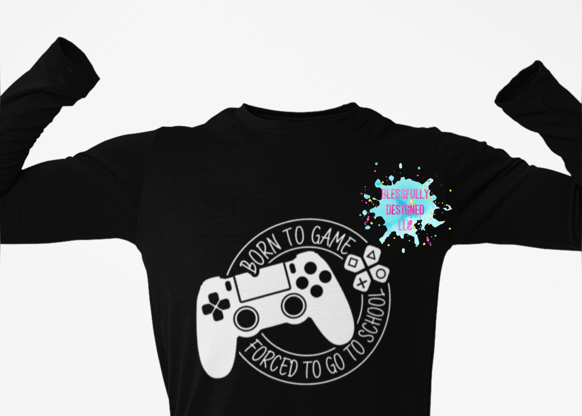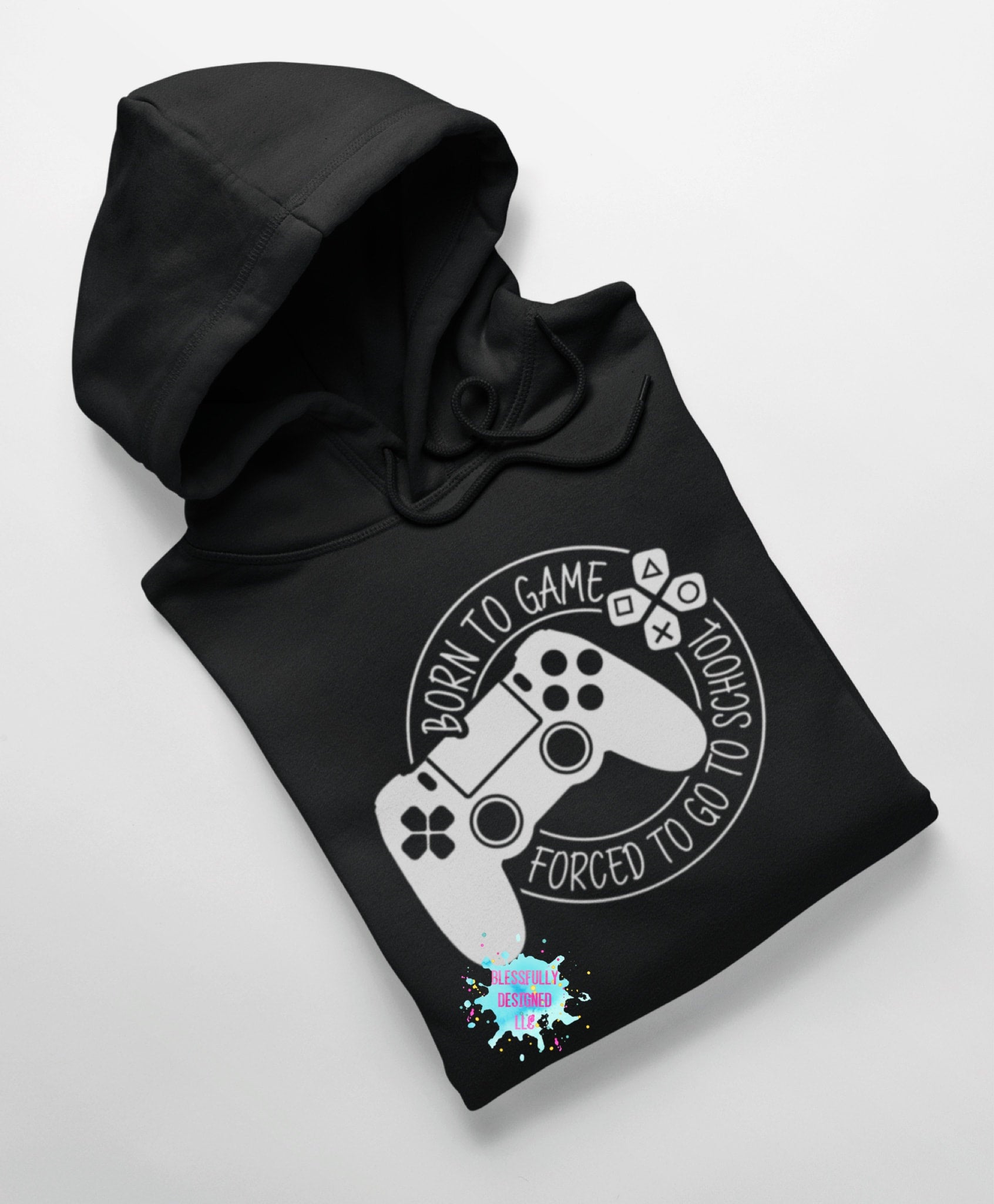 • 100% cotton • Unisex • Black • White design • “Born to game forced to go to school”