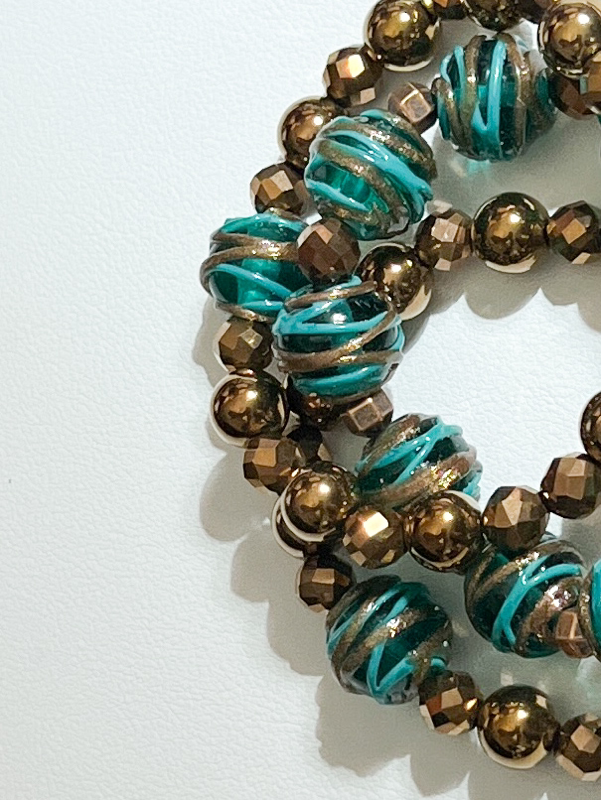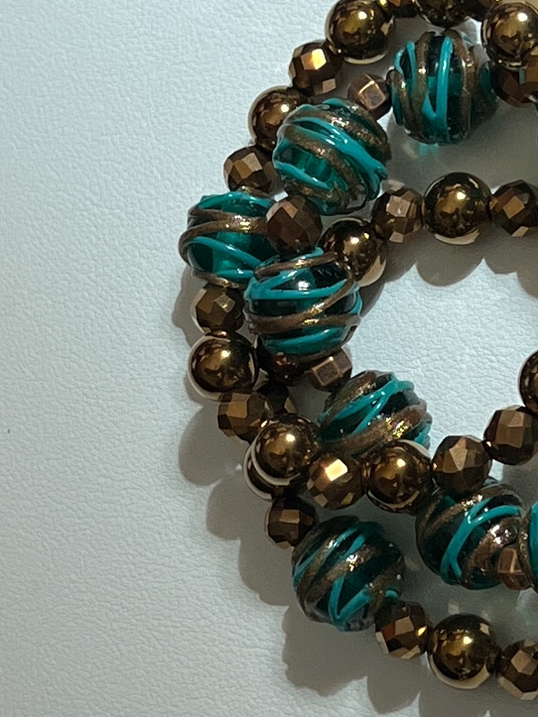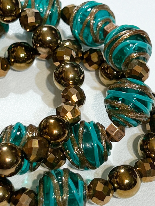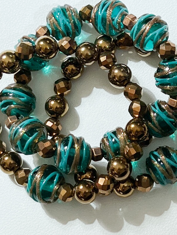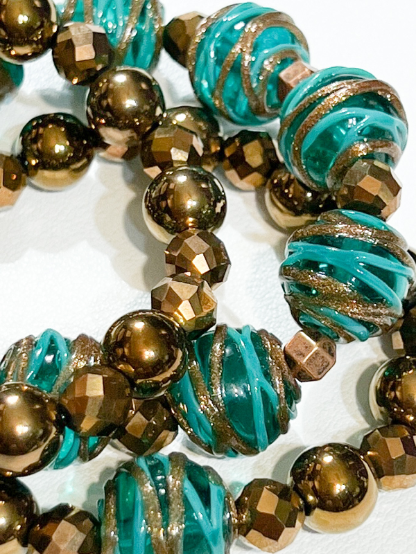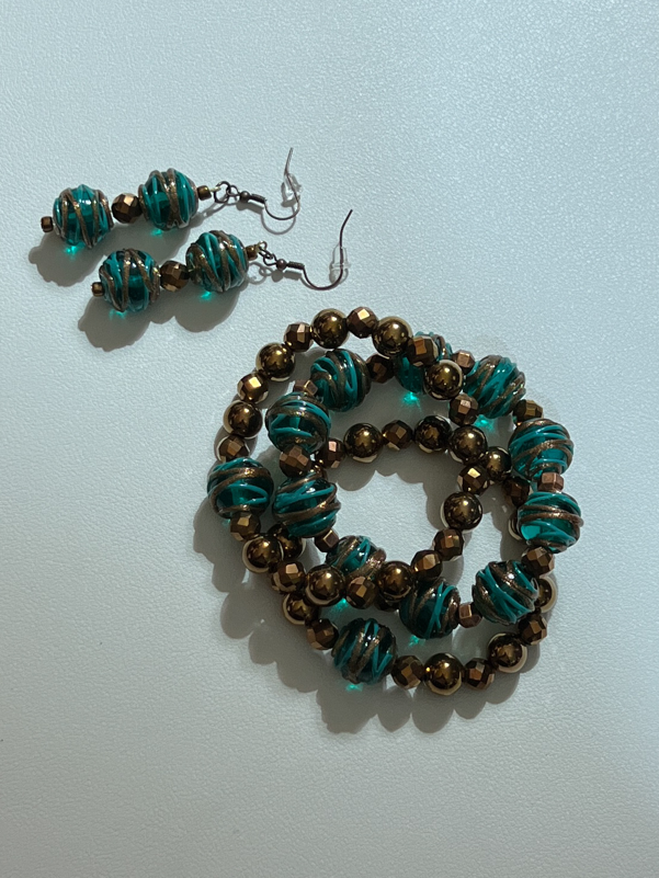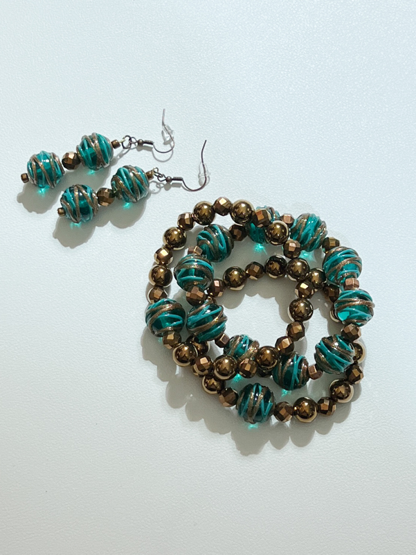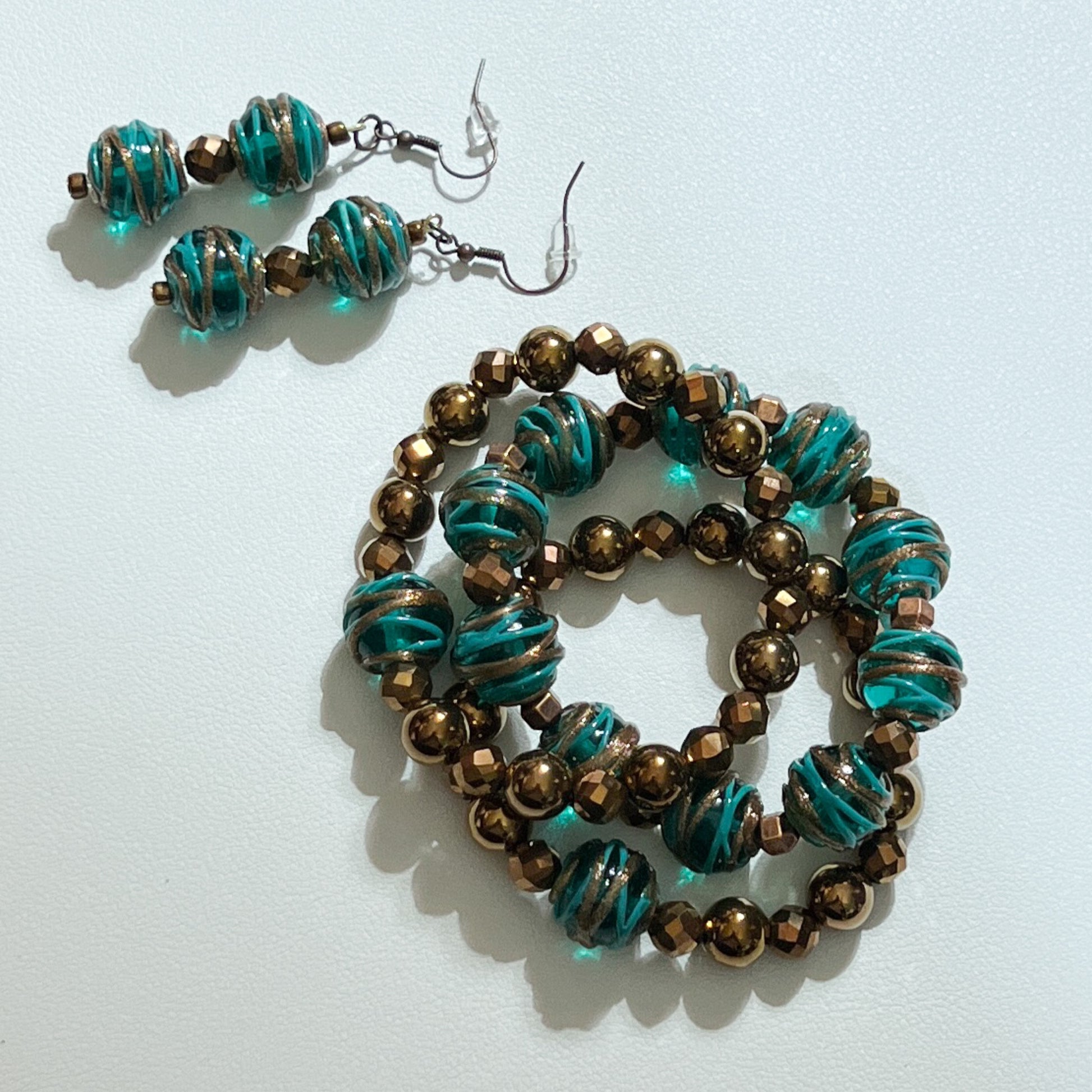 Be the epitome of elegance with the Bronzed Queen Jewelry collection. Crafted with high-quality materials, these timeless pieces exude a beauty that lasts a lifetime. The set includes three stunning stretch bracelets and matching earrings, featuring a mesmerizing combination of aqua mixed with bronze; glitter, and glass mixed with hematite. Fits wrists size 7.25/7.5” Embrace your inner queen and add a touch of sophistication to any outfit with the Bronzed Queen Jewelry collection!