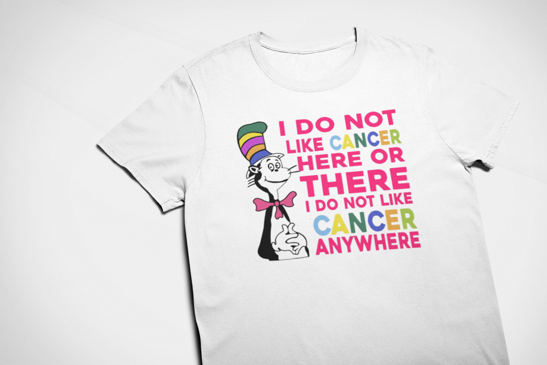 White shirt • colorful design • cancer awareness • short or long sleeves available • unisex sizing