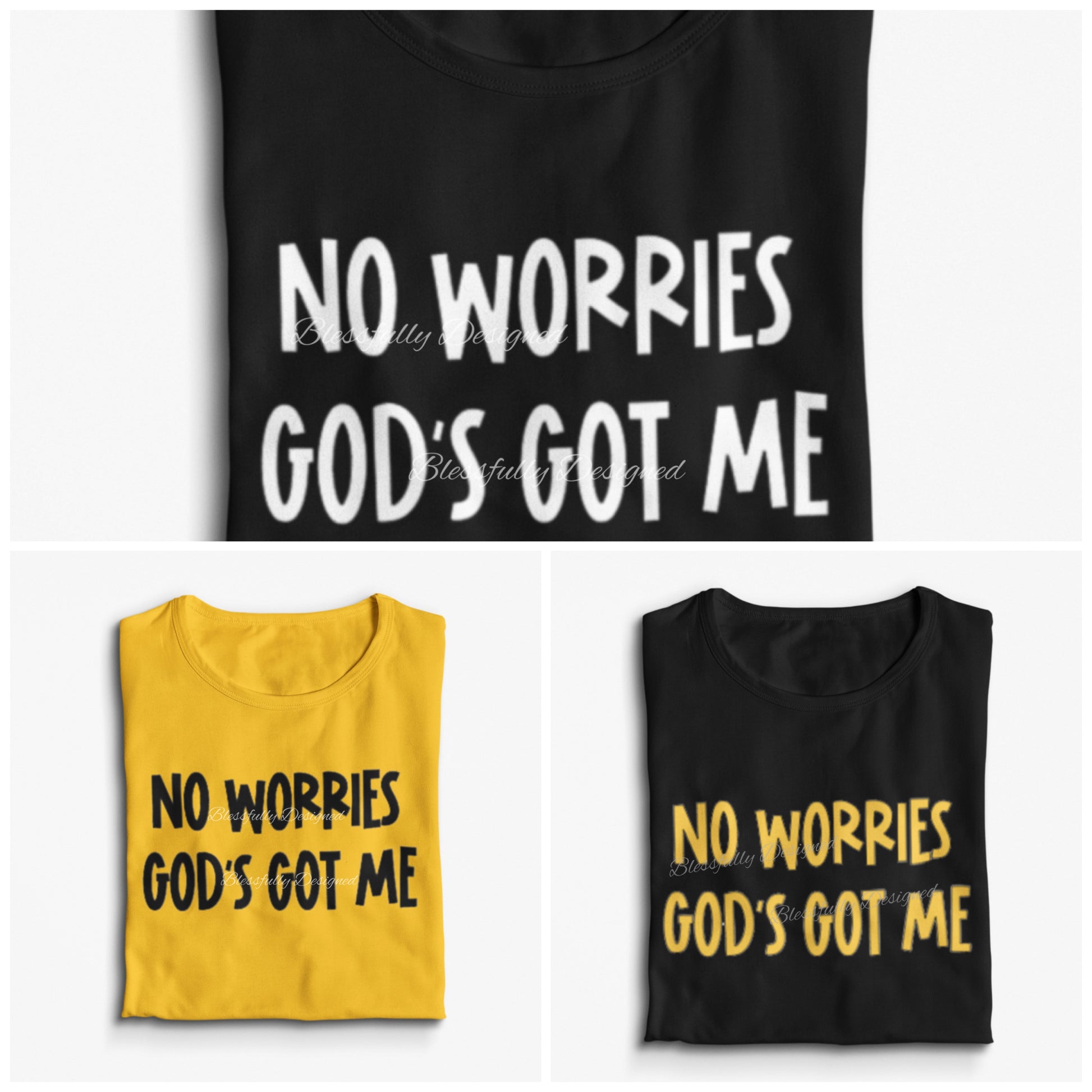 100% cotton • Crewneck • Unisex Sizing • Short Sleeve Shirt • Vinyl Design: "No Worries God's Got Me"