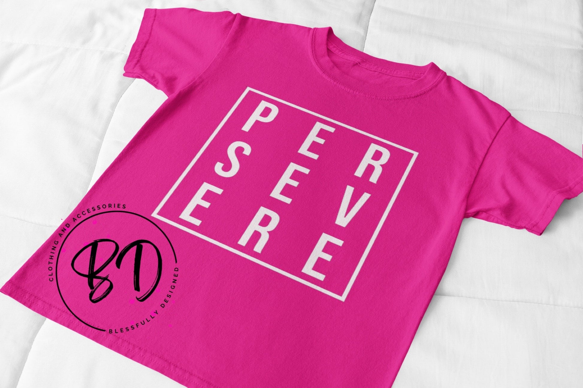 100% cotton • Black • Crewneck • Unisex Sizing • Short Sleeve Shirt • Vinyl Design: "Persevere"