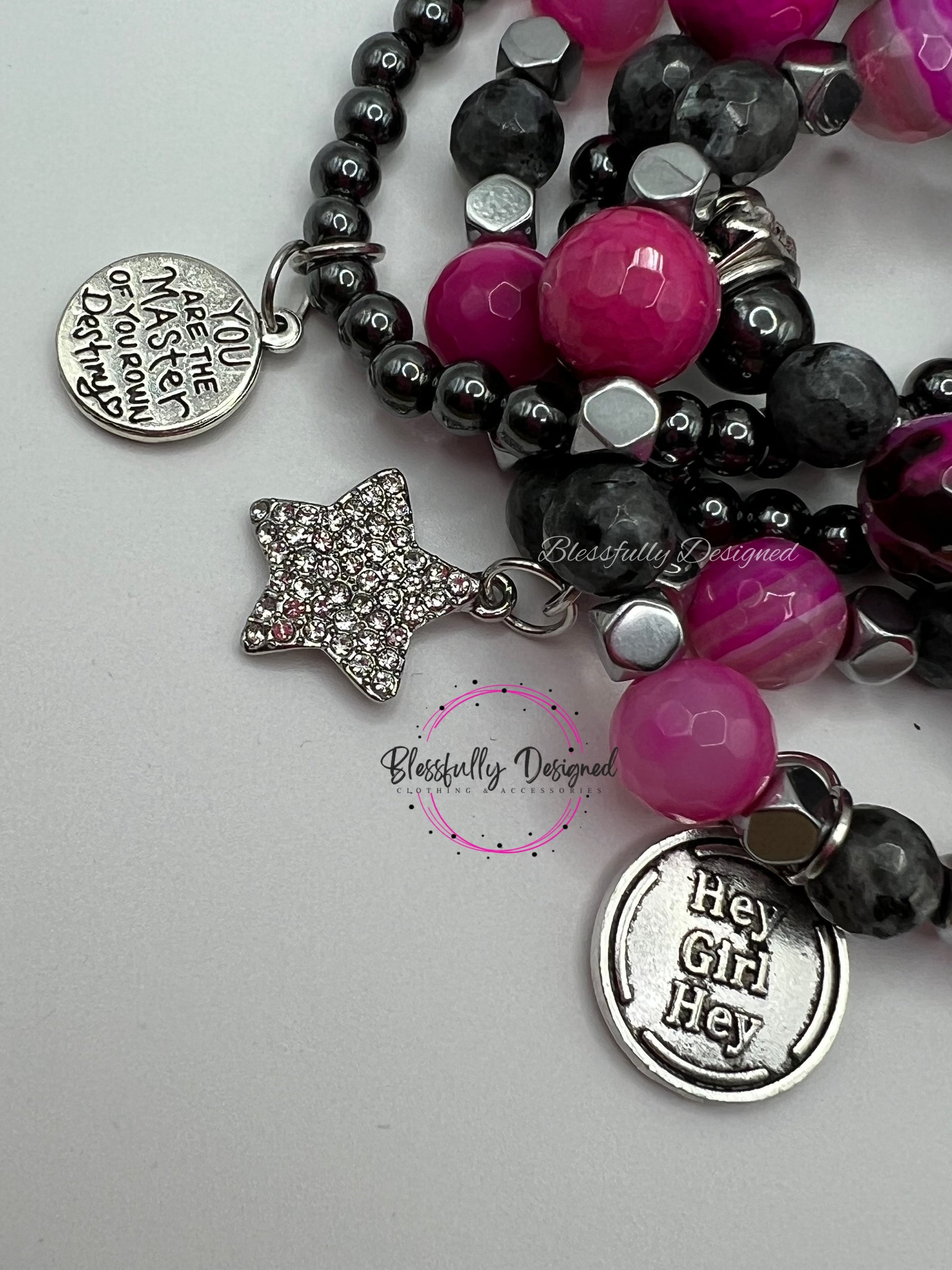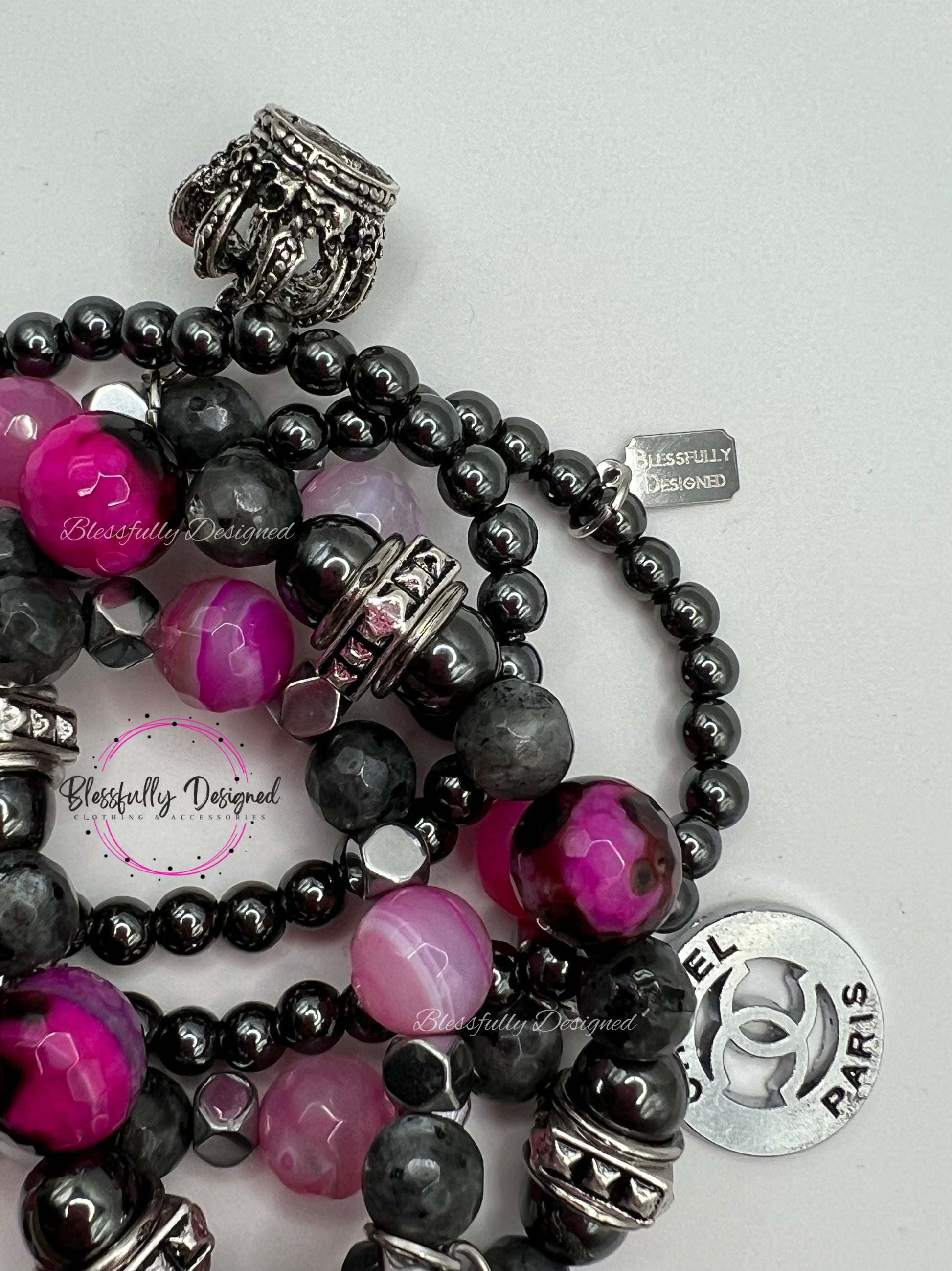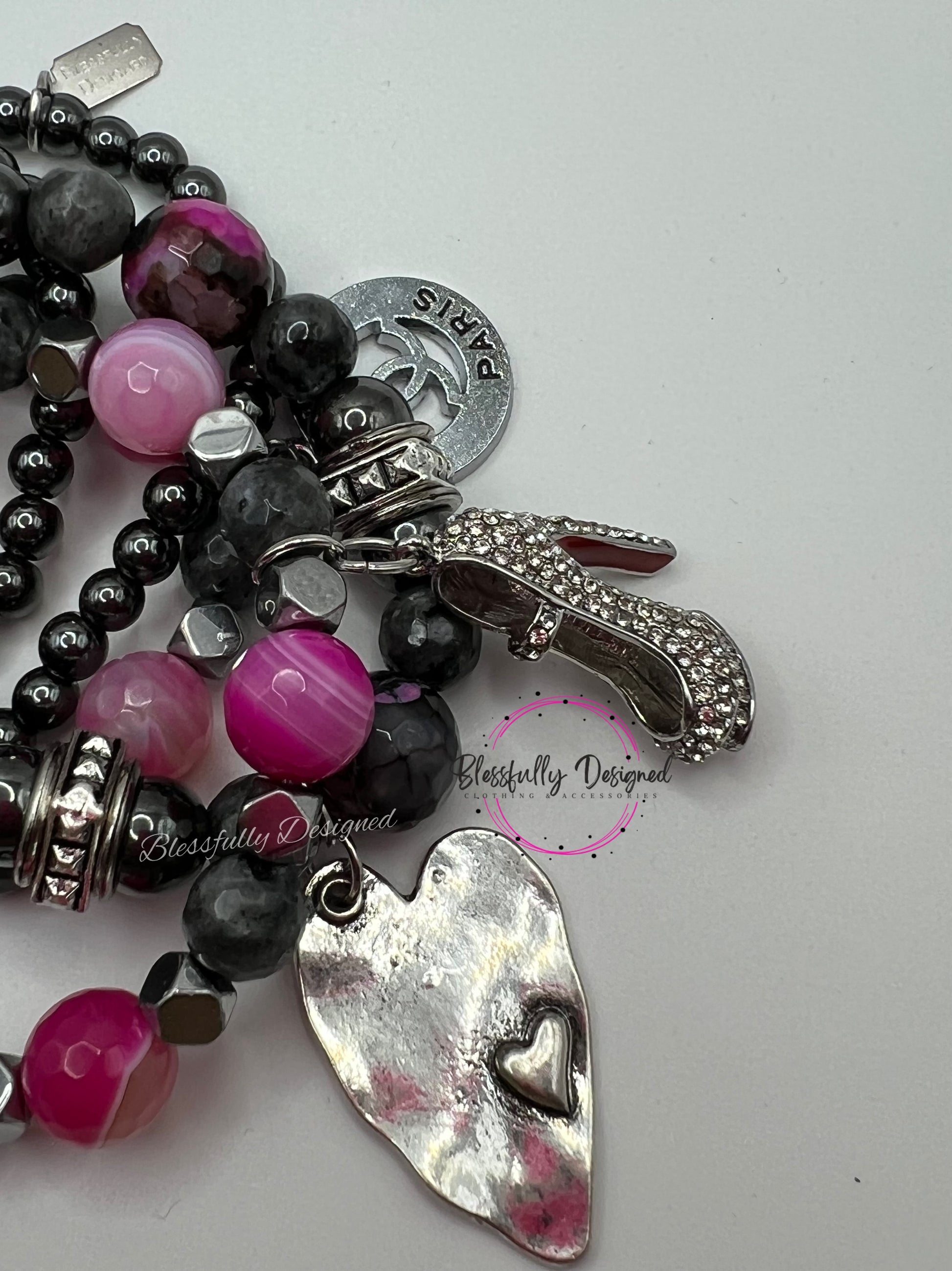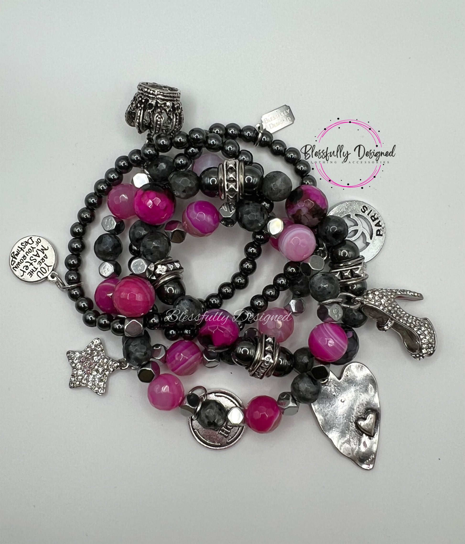 A mix of 8mm, 10mm & 12mm sized beads • labradorite, hematite & agate • Colors are a mix of pink, gray, & silver • Charms are a mix of stainless steel, rhinestone & inspirational charms • Fits size 7.5” wrist