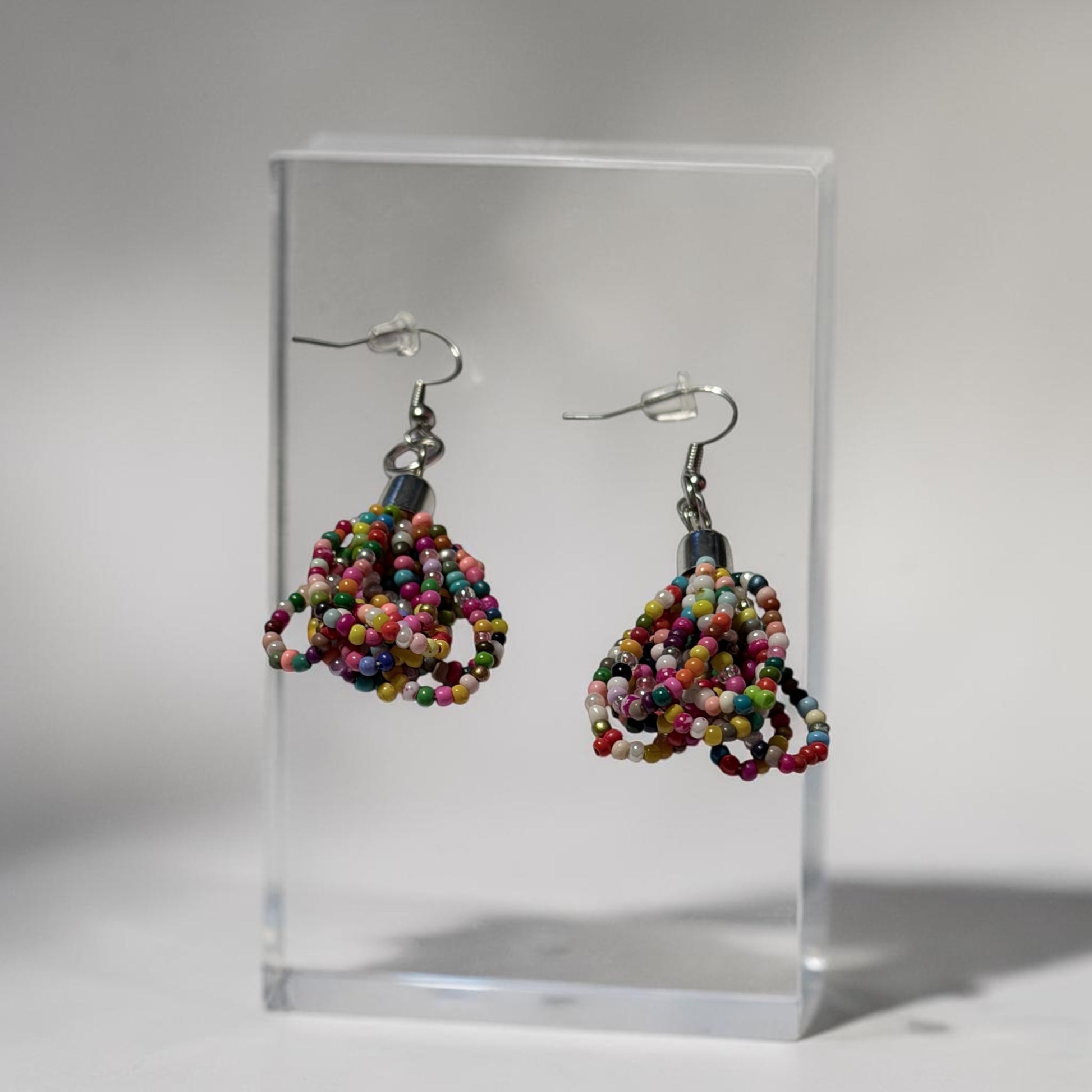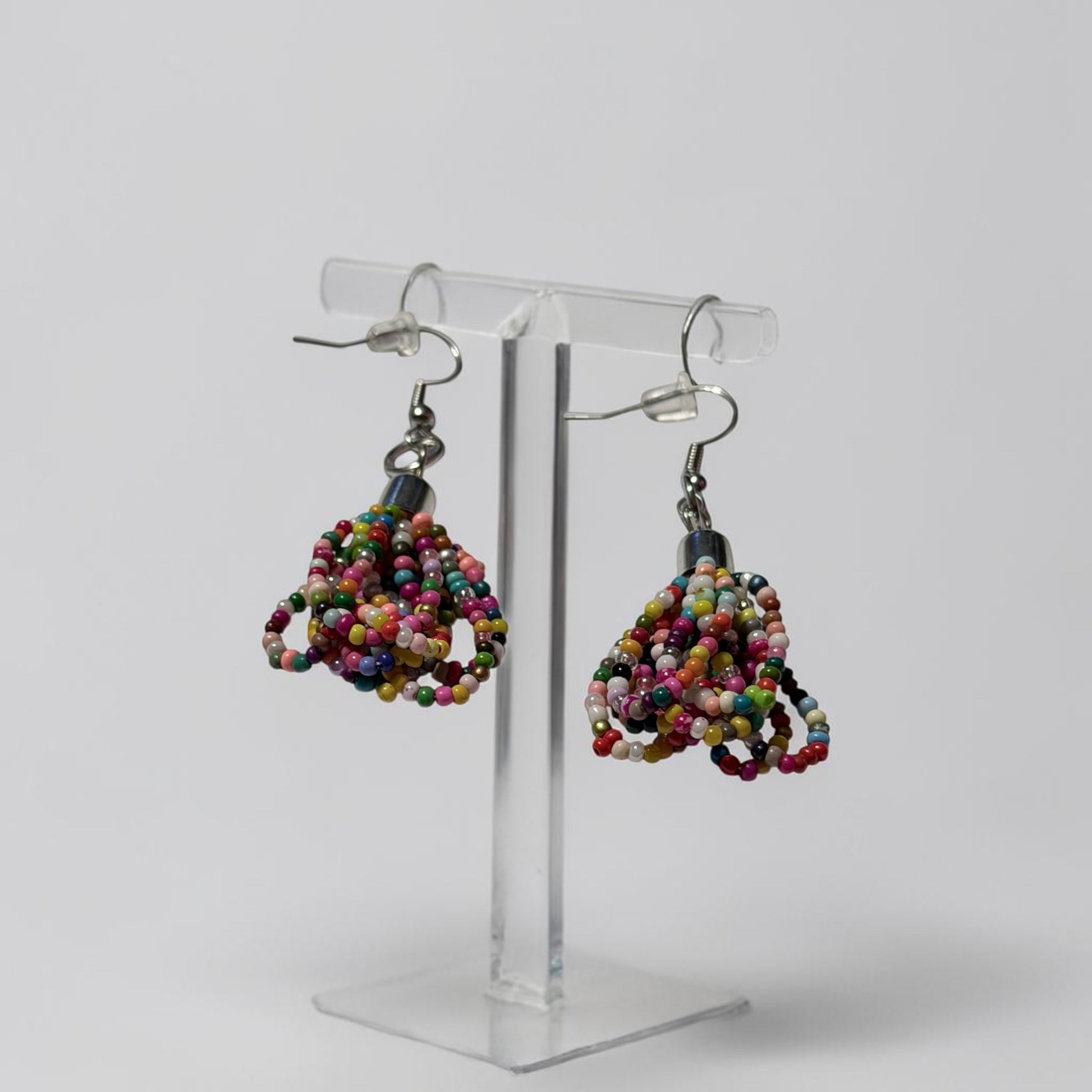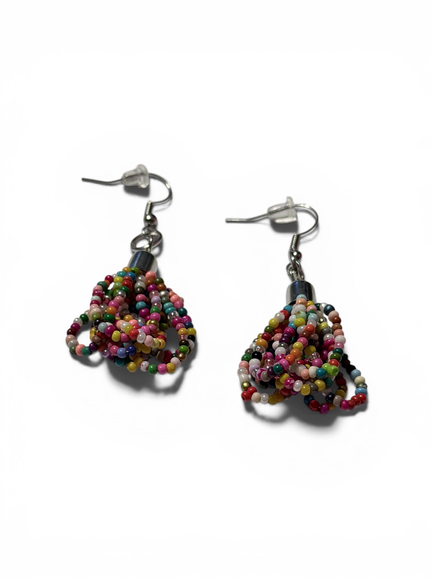 Add a playful pop of color to your look with these handcrafted beaded dangle earrings. Designed with clusters of vibrant, multi-colored seed beads, each pair creates a unique, eye-catching texture that moves beautifully with you. The lightweight design ensures all-day comfort, while the silver-tone hooks provide an easy, secure fit.