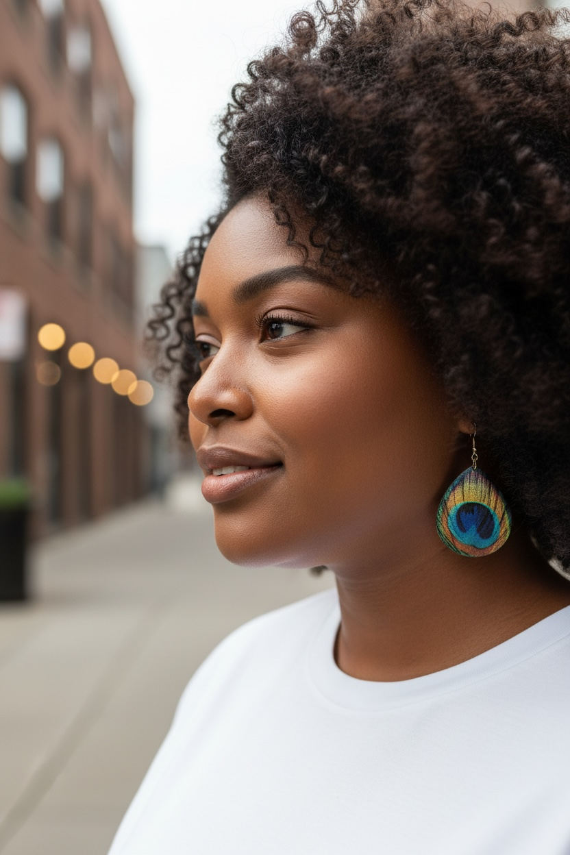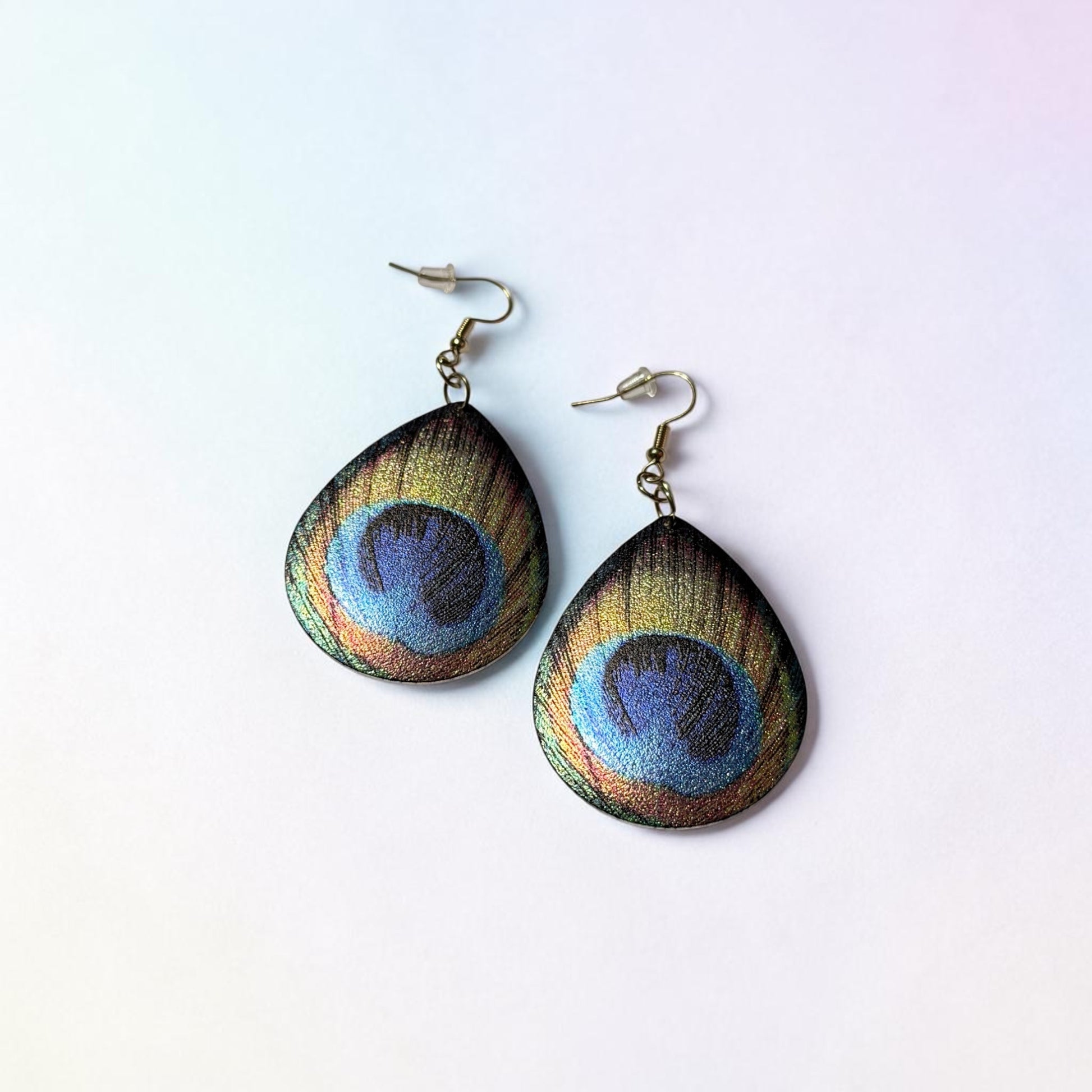 Make a bold, eye-catching statement with these iridescent peacock feather earrings. Designed in a classic teardrop silhouette, each piece features a vibrant, color-shifting pattern that reflects rich tones of blue, green, gold, and bronze—resembling the natural beauty of a peacock plume.