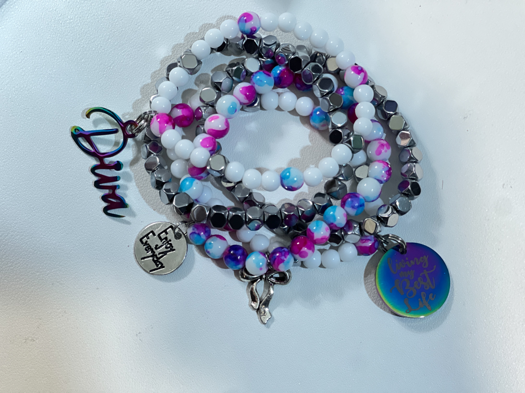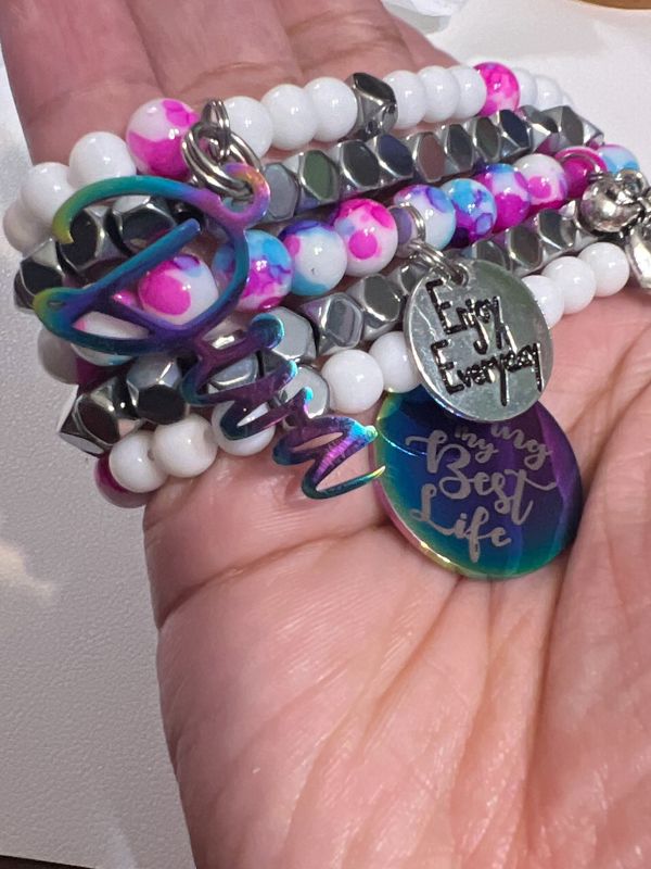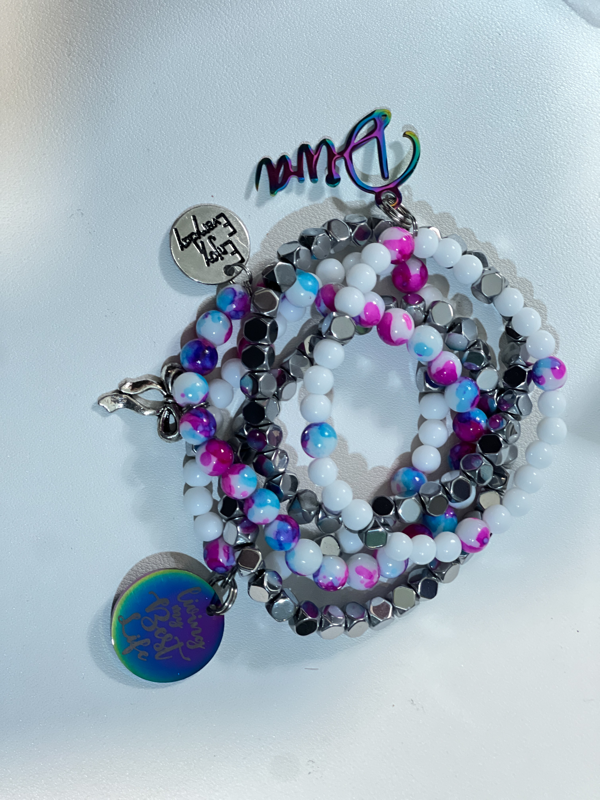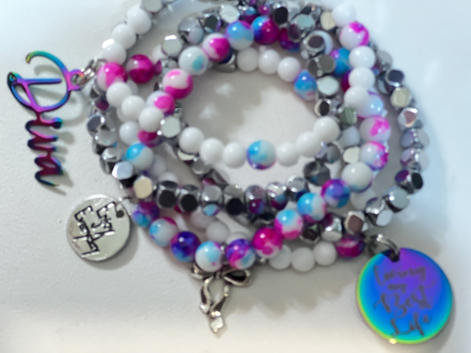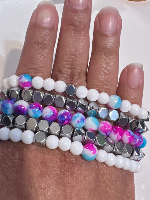 Introducing our enchanting Watercolors 5-piece beaded bracelet set, meticulously crafted with a blend of 6mm/8mm aqua, purple, white, and hematite beads. Each bracelet is adorned with captivating rainbow/holographic and silver charms, adding a touch of whimsical charm to every wrist. Designed to fit a size 7 1/2” wrist, this set promises to elevate your style with its vibrant colors and elegant accents. Embrace the beauty of the rainbow with this exquisite accessory collection.