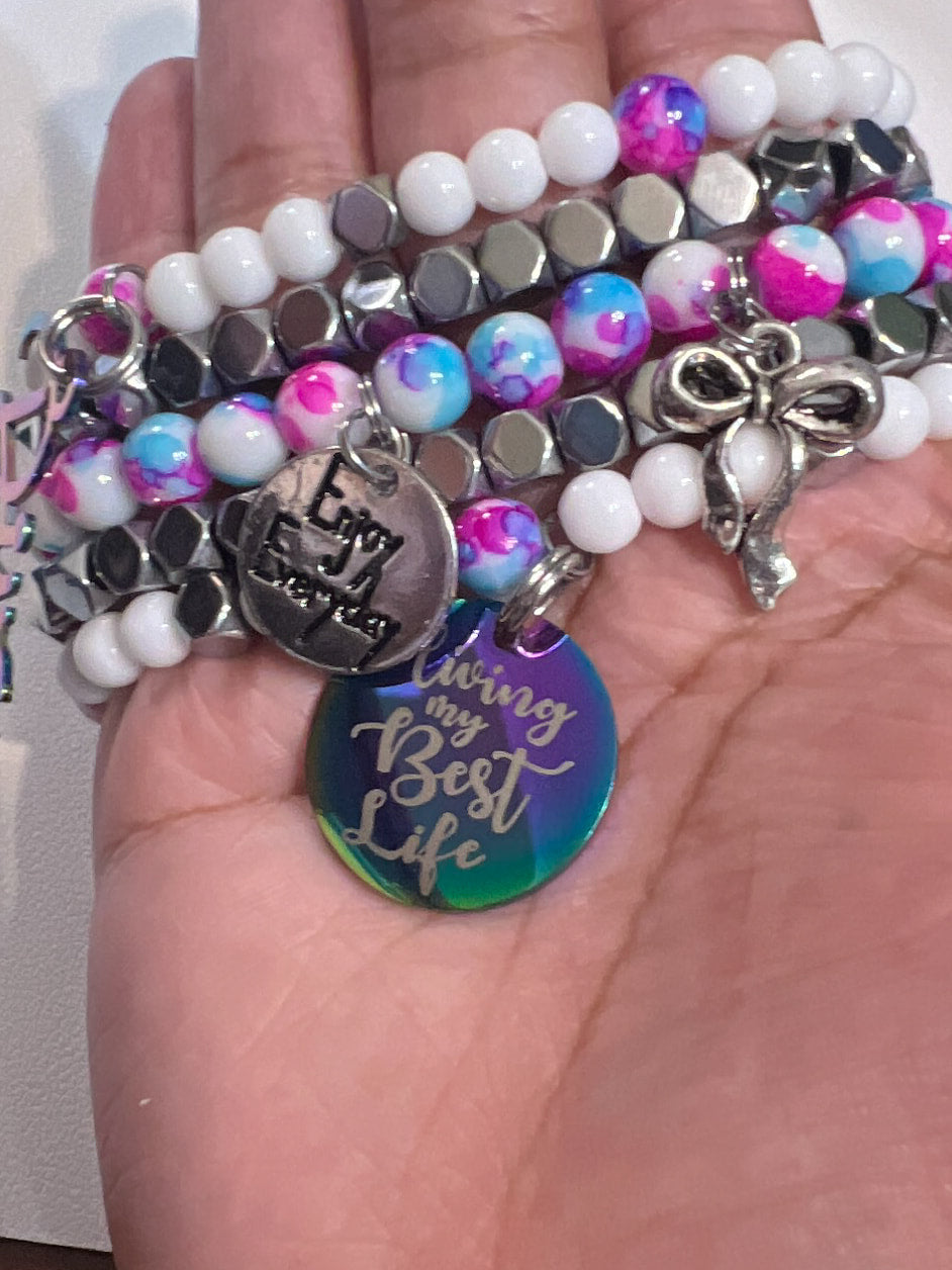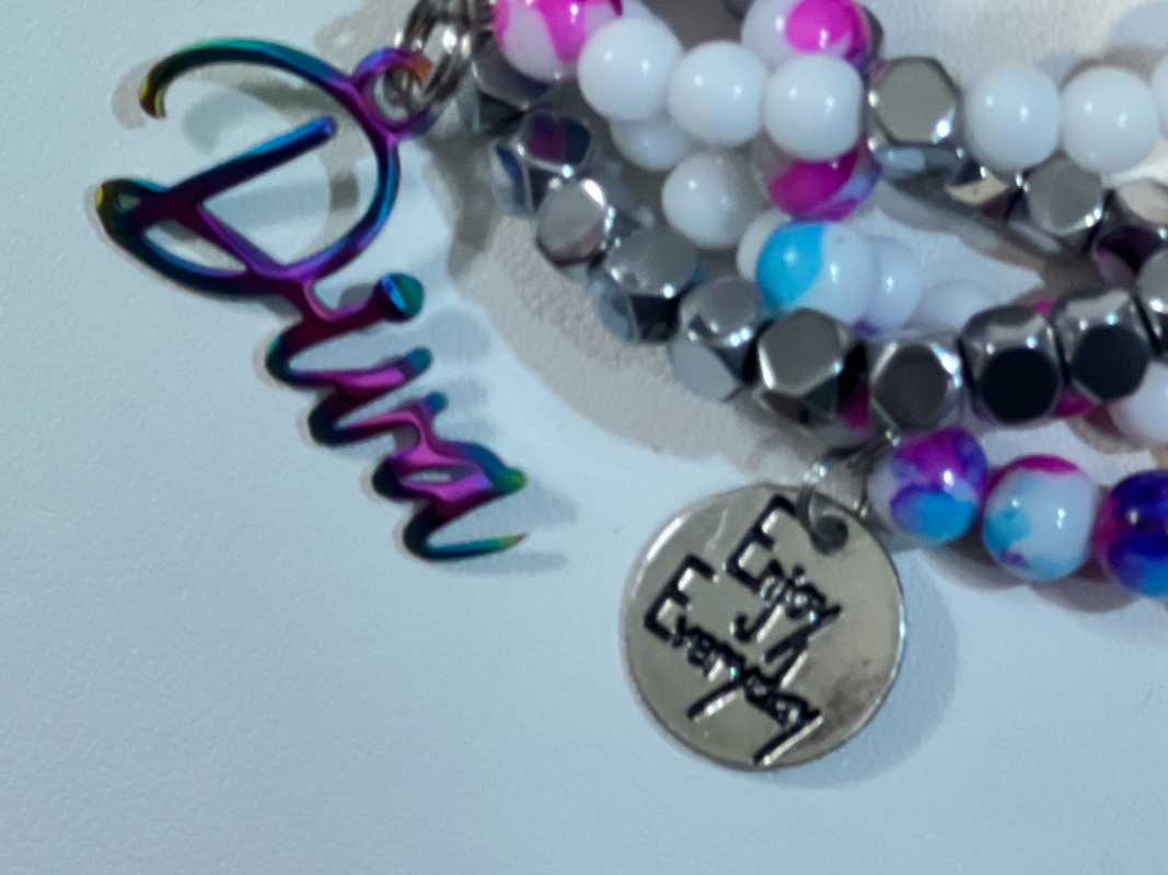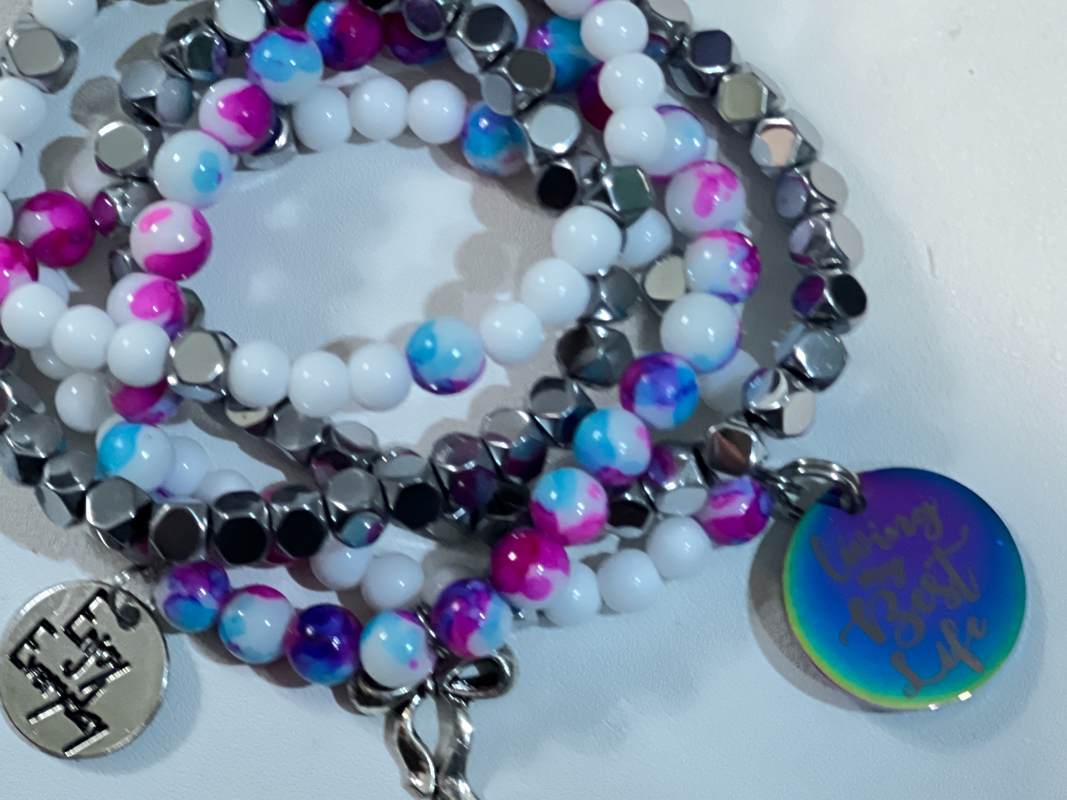 Introducing our enchanting Watercolors 5-piece beaded bracelet set, meticulously crafted with a blend of 6mm/8mm aqua, purple, white, and hematite beads. Each bracelet is adorned with captivating rainbow/holographic and silver charms, adding a touch of whimsical charm to every wrist. Designed to fit a size 7 1/2” wrist, this set promises to elevate your style with its vibrant colors and elegant accents. Embrace the beauty of the rainbow with this exquisite accessory collection.