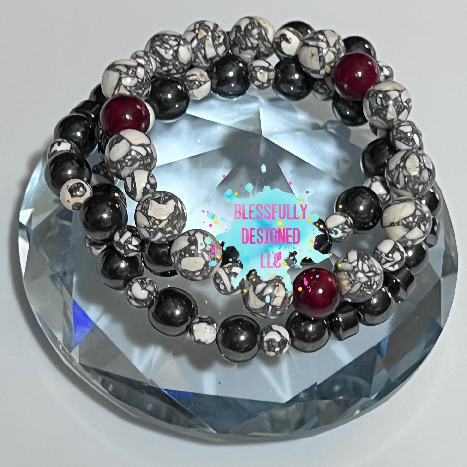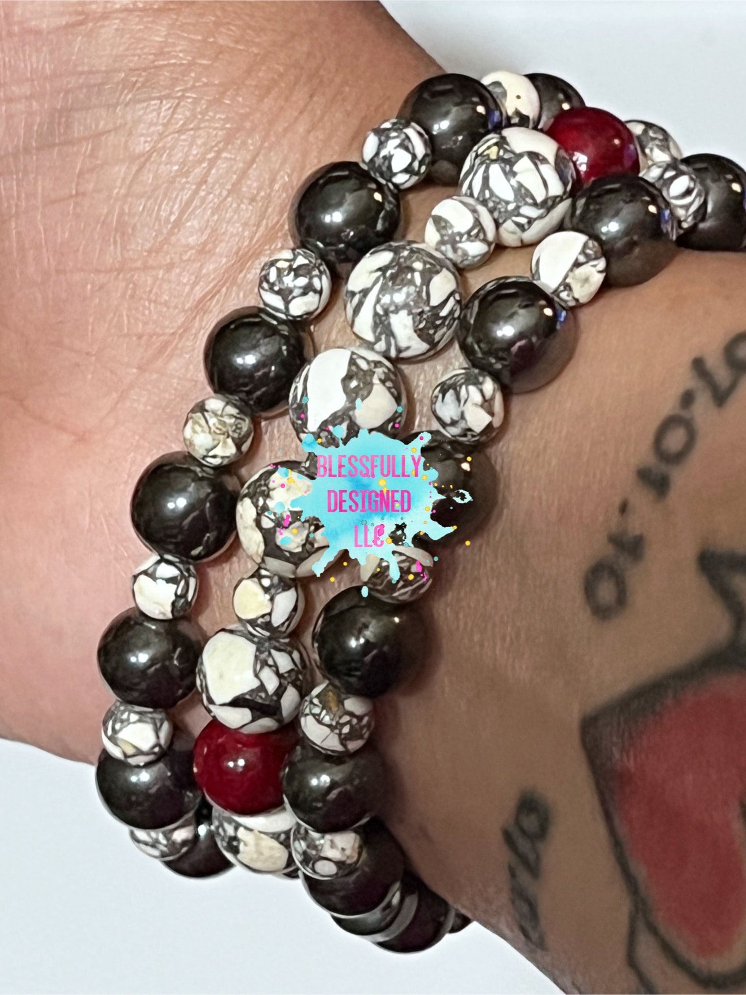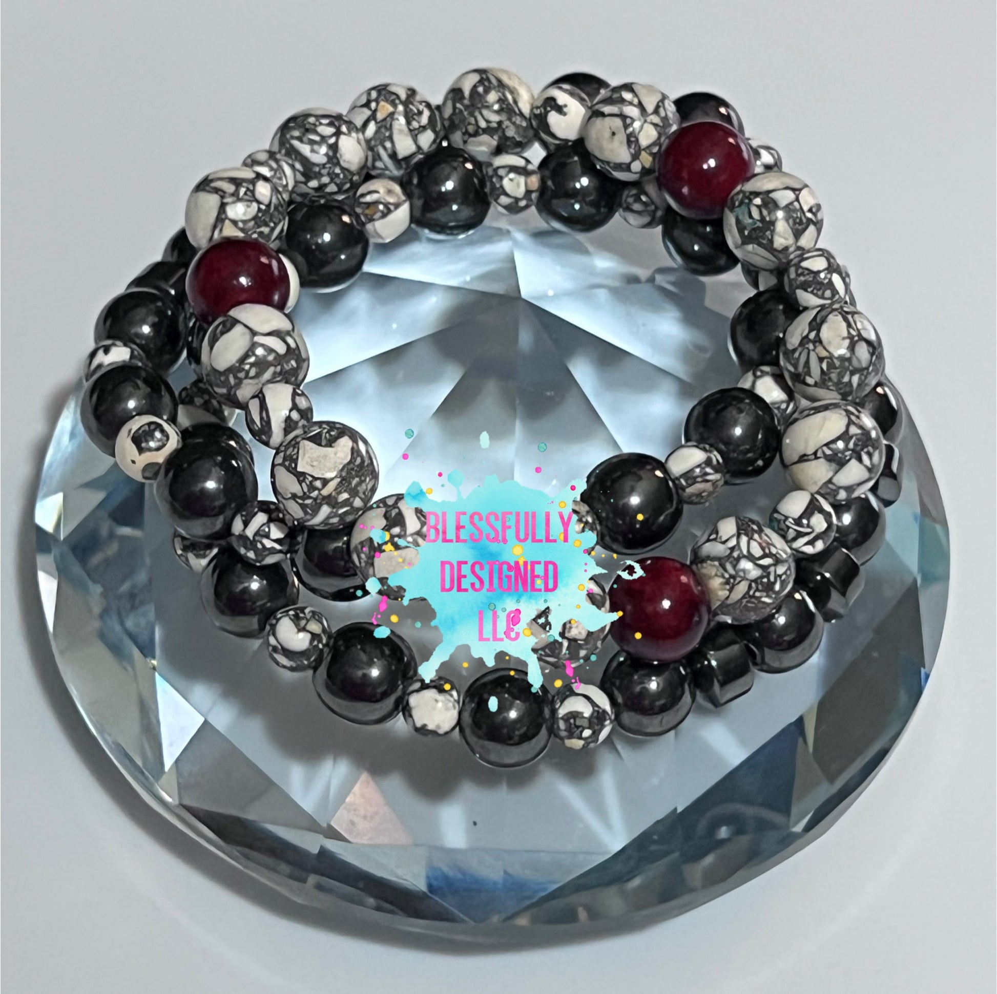 Add a touch of elegance and sophistication to your jewelry collection with Crackle. This stunning bracelet features a mix of 6mm and 10mm beads made from hematite, white howlite, and red dyed quartzite. With its unique combination of colors and textures, this bracelet set is the perfect accessory to complement any outfit. Get ready to turn heads and make a statement with Crackle!