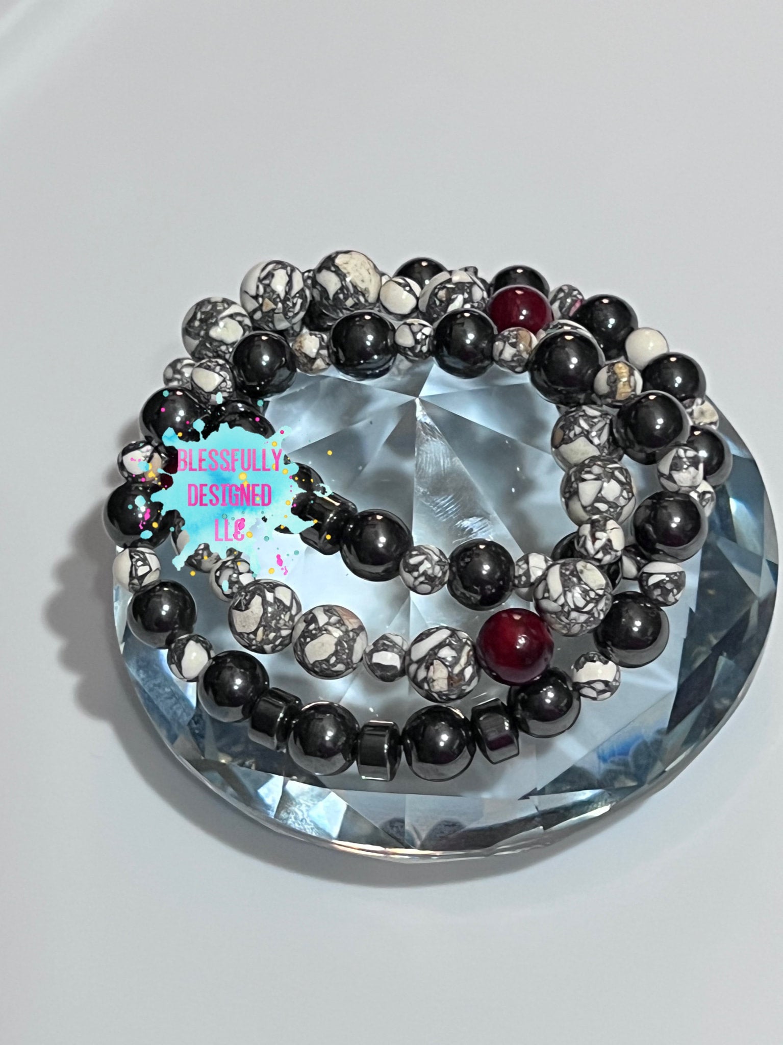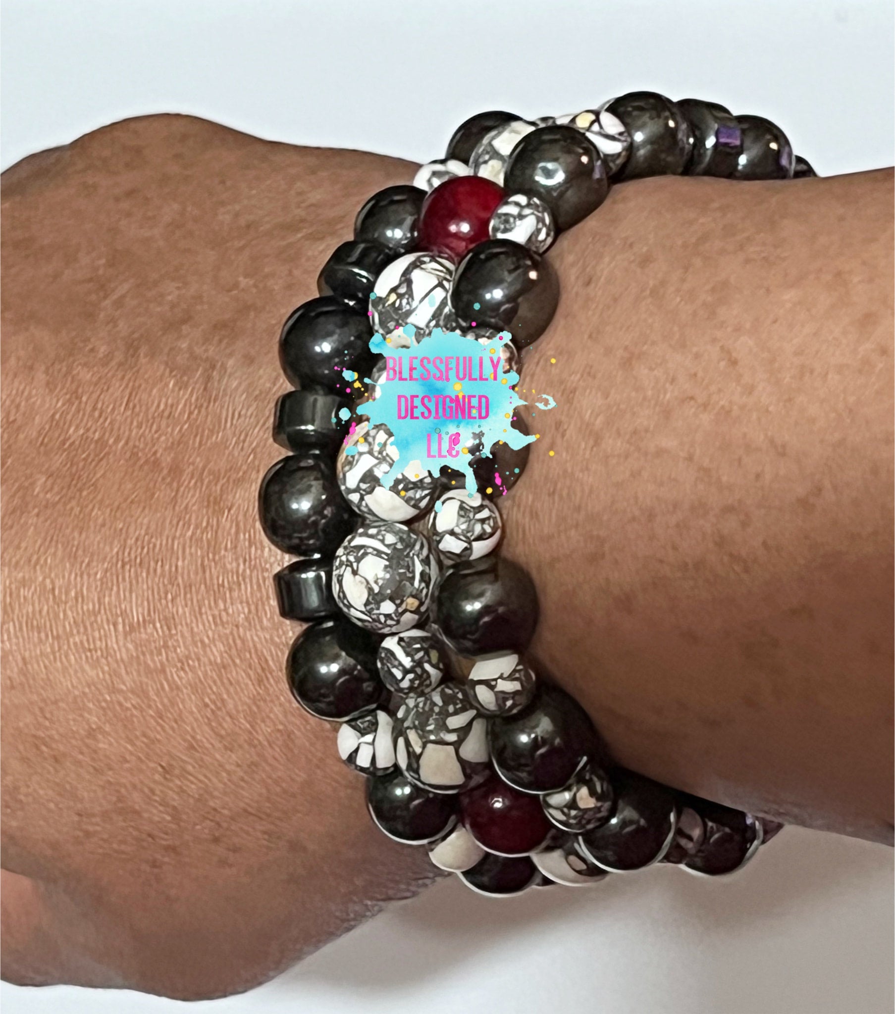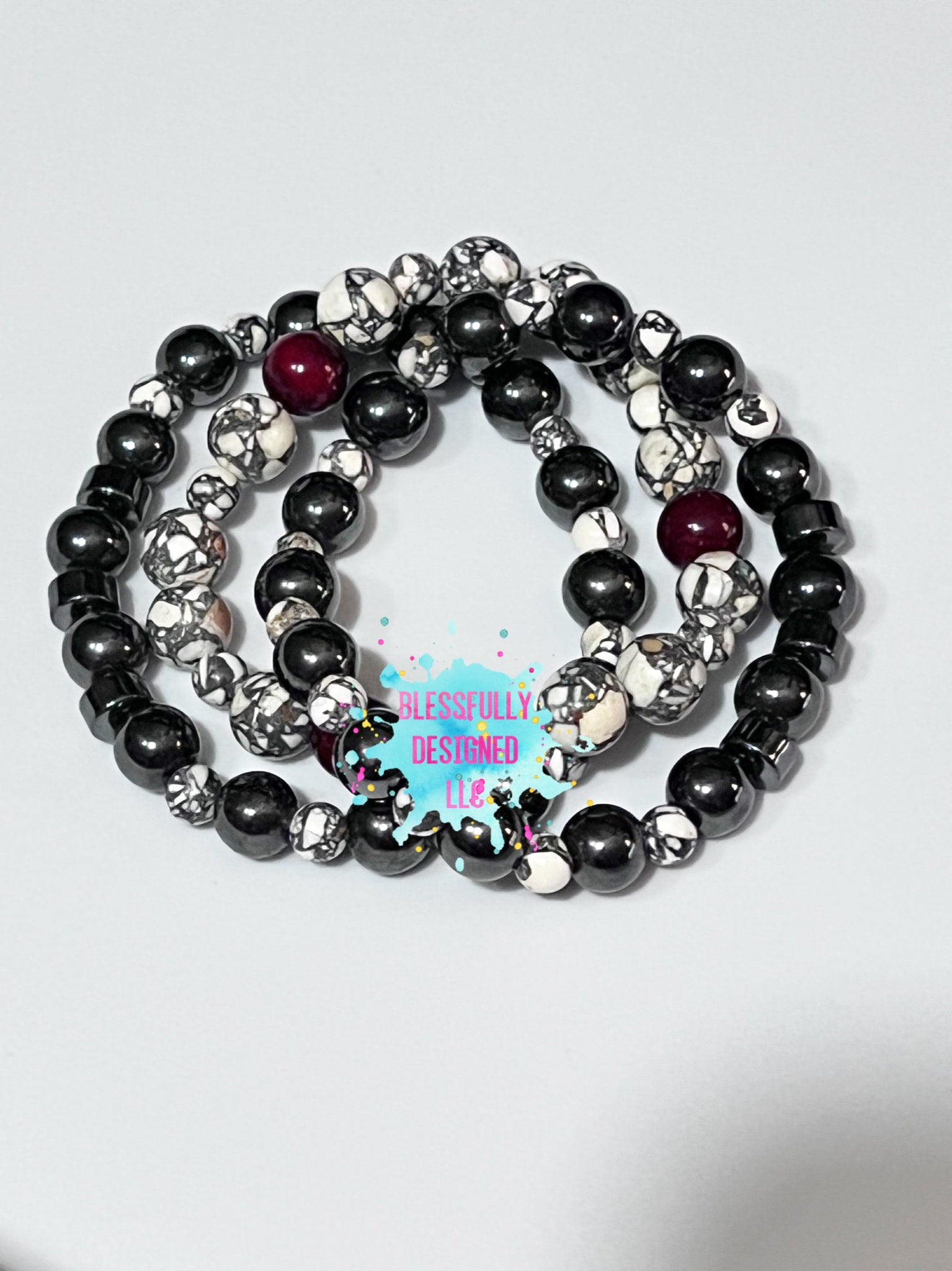 Add a touch of elegance and sophistication to your jewelry collection with Crackle. This stunning bracelet features a mix of 6mm and 10mm beads made from hematite, white howlite, and red dyed quartzite. With its unique combination of colors and textures, this bracelet set is the perfect accessory to complement any outfit. Get ready to turn heads and make a statement with Crackle!